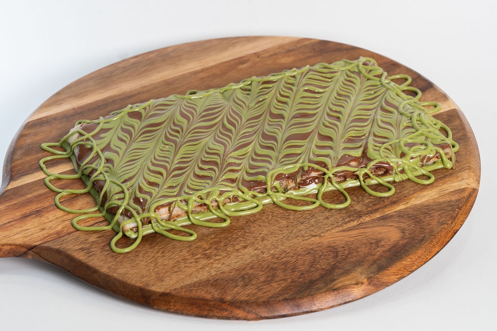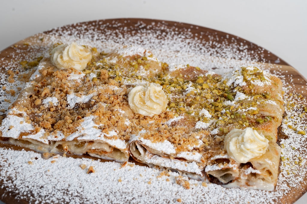 Authentic traditional layered dough like nothing you ever seen, crispy on the outside, soft on the inside, clay oven baked filled with custard & Nutella with an option to add pistachio & or hazelnut