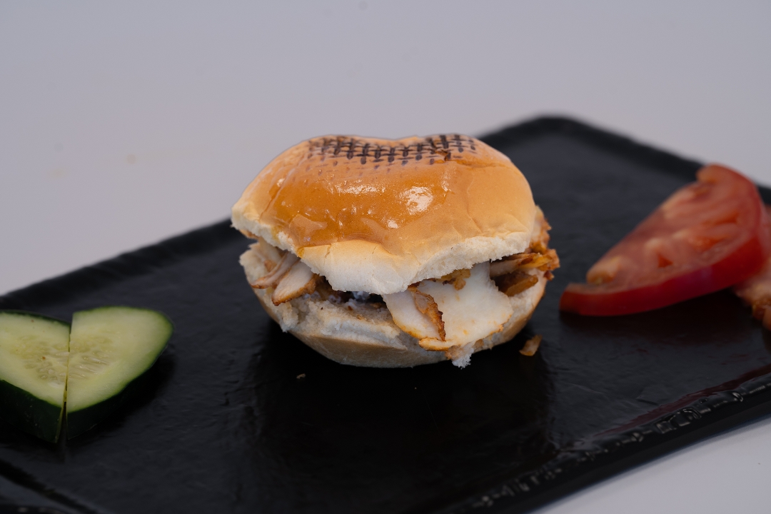 A very well marinated Charcoal grilled chicken breast cubes wrapped in Saj bread mixed with Garlic sauce, tomatoes & onions