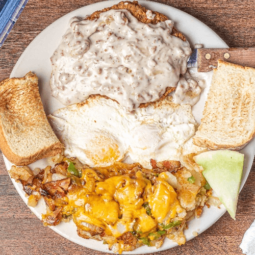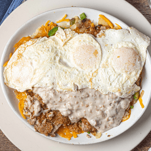 Seasoned potatoes with peppers, onions, country fried steak, Cheddar cheese and topped with sausage gravy!