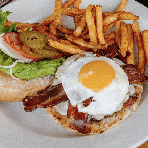 A must-try burger featuring a juicy beef patty, crispy bacon, melted cheese, and a perfectly fried egg, all stacked high on a soft, fresh bun.