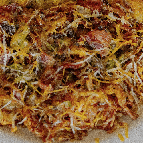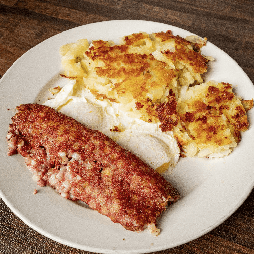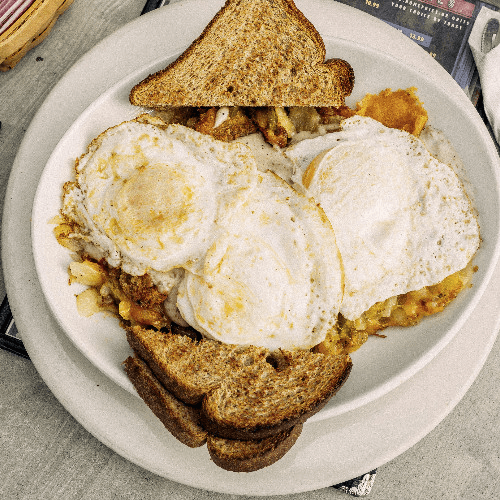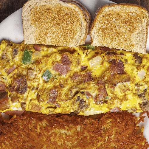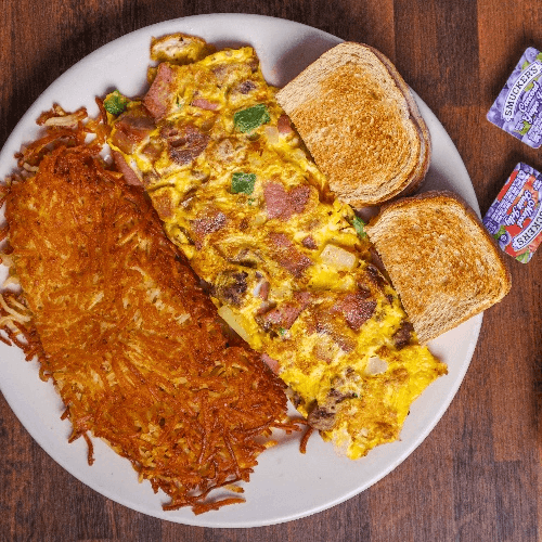 Seasoned potatoes with peppers, onions, ham, bacon and sausage and topped with Cheddar cheese.