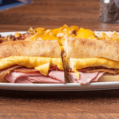 Our signature club sandwich! Featuring layers of premium smoked ham, crispy bacon, fresh lettuce, ripe tomato, fried egg, American cheese and mayo, all piled high between toasted bread.