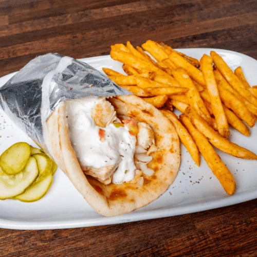 A classic Greek favorite! Tender, seasoned lamb and beef gyro meat, cooked to perfection and wrapped in a warm pita. Topped with fresh tomatoes, onions, and a creamy tzatziki sauce for the ultimate flavor experience.