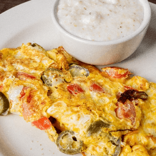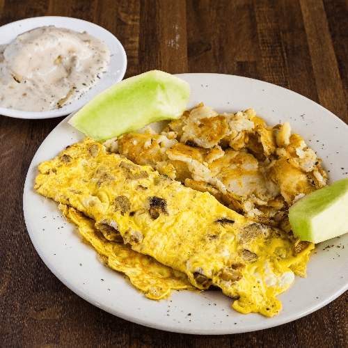4 eggs omelet with sausage, American cheese, side of half biscuits & gravy and your choice of: home fries, grits or hashbrowns.