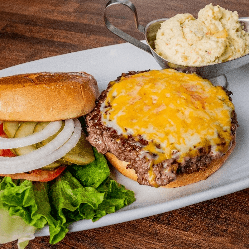 Enjoy our timeless Classic Cheeseburger featuring a juicy beef patty topped with melted American cheese, fresh lettuce, ripe tomatoes, and pickles, all served on a soft bun. This simple yet satisfying burger is perfect on its own or can be customized to your liking!