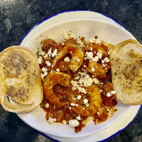 Succulent shrimp sautéed in a rich tomato sauce with garlic, onions, and herbs, topped with crumbled feta cheese and baked to perfection. Served with warm, toasted pita bread for dipping, this Mediterranean-inspired dish offers a delightful balance of savory and creamy flavors.