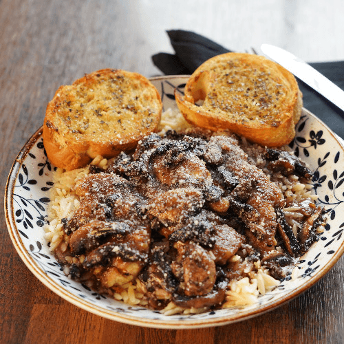 Experience a Greek classic bursting with rich flavors! Lightly breaded chicken cutlets sautéed with garlic and mushrooms, topped with a delectable sweet Greek wine reduction sauce. Served over a bed of orzo pasta for a satisfying meal.
