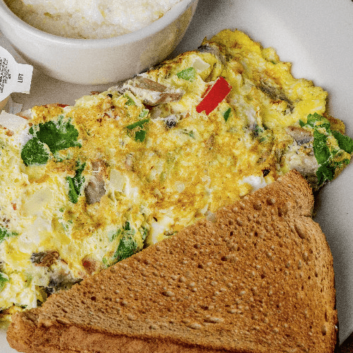 Choose 3 items: Ham, bacon, sausage, gyro meat, spinach, tomato, onions, peppers, mushrooms, feta, American cheese, provolone, Swiss cheese, cheddar cheese. Each additional item for additional cost.