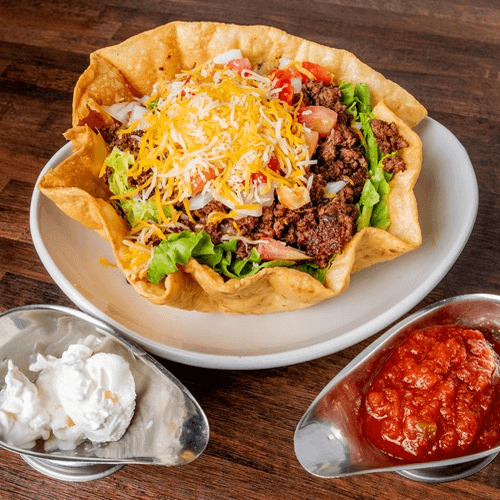 Dig into a crispy taco shell filled with seasoned ground beef, fresh lettuce, diced tomatoes, onions, Cheddar cheese, jalapeños, salsa, and a dollop of sour cream. This hearty salad is bursting with flavor and perfect for any taco lover!