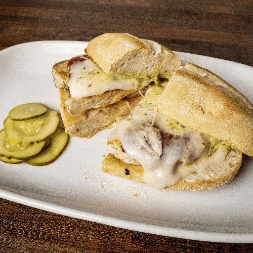 Marinated chicken breast, grilled to perfection, topped with sundried tomatoes, grilled mushrooms, feta cheese, and red onions, all finished with a creamy whipped feta spread. Served on our fresh ciabatta bread.