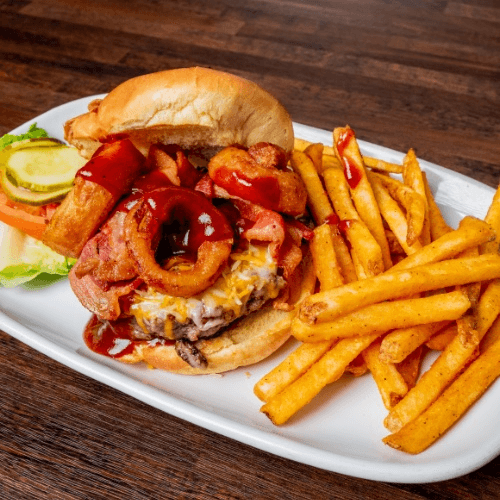 Indulge in our mouthwatering Dallas BBQ Cheeseburger, featuring a juicy beef patty topped with tangy barbecue sauce, melted cheddar cheese, crispy onion rings, and fresh pickles. Served on a soft bun, this burger delivers a perfect blend of smoky and savory flavors that will satisfy your cravings!