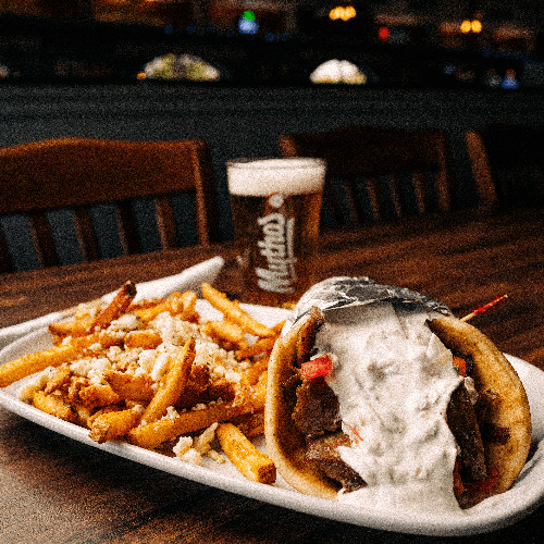 Experience the ultimate gyro with our colossal open-face creation! Nestled on warm pita bread, this generous platter features tender gyro meat, accompanied by a refreshing Greek salad, crispy fries, and a rich tzatziki sauce for a burst of flavor in every bite.