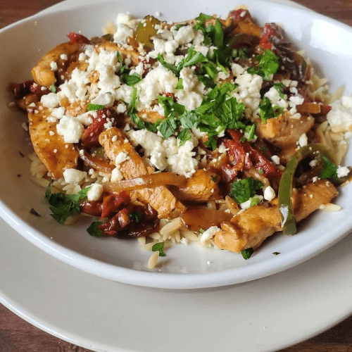 Enjoy sautéed chicken breast complemented by onions, peppers, sun-dried tomatoes, and Kalamata olives, all simmered in a rich lemon butter sauce. Served over orzo pasta and topped with crumbled feta cheese for a flavorful and satisfying dish.