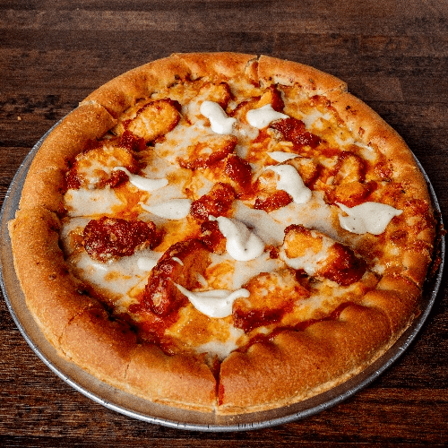 Topped with garlic butter sauce, tender buffalo chicken strips, crispy bacon bits, and a ranch drizzle for a flavorful kick.