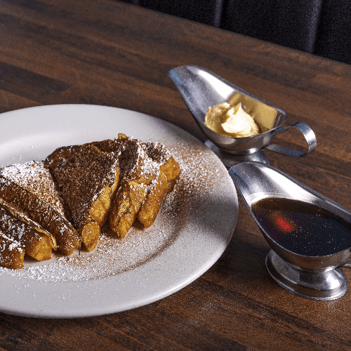 The Ultimate and our most famous Brunch Burger! A juicy beef patty nestled between two golden, buttery slices of French toast, topped with melted cheese, crispy bacon, and a drizzle of our bacon maple syrup.