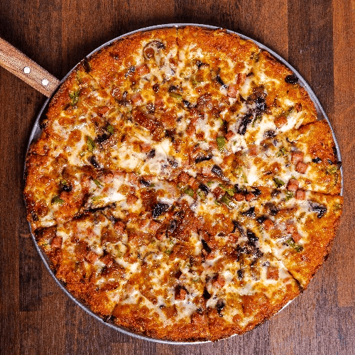Large 14". Includes ham, bacon, onions, green peppers, mushrooms
