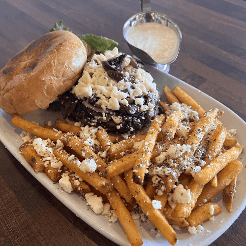 A juicy beef patty topped with grilled onions, sautéed mushrooms, briny Kalamata olives, and creamy feta cheese. Finished off with our rich tirosalata (Feta dip) for an authentic Greek flavor that will transport your taste buds!