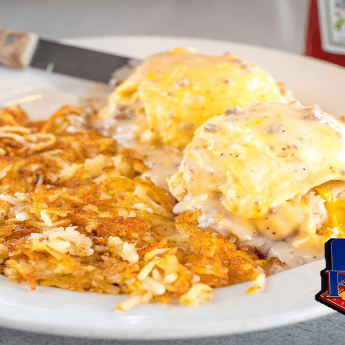 Eggs over sausage patties on our homemade biscuit with sausage gravy and American cheese.