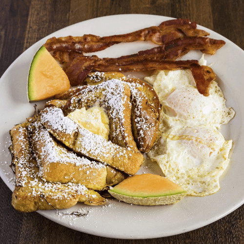 3 pancakes, Belgian waffle or French toast with 2 eggs any style and bacon, ham or sausage.