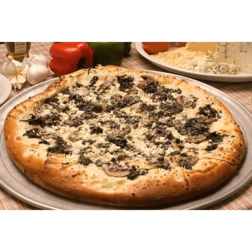 White cheese base, spinach, garlic, fresh mushrooms, onions, pecorino Romano cheese, feta cheese, pizza cheeses.