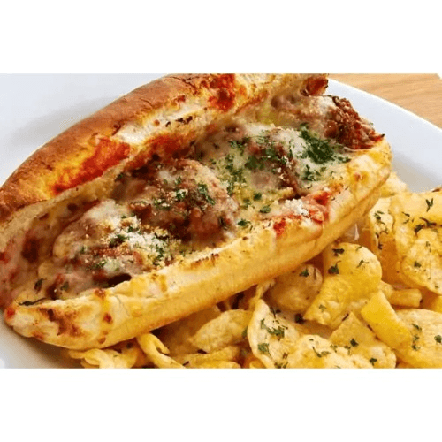 House-made meatballs simmered in our house-made marinara sauce. Topped with our house cheese blend, parmesan cheese on a house-made toasted roll. Additional toppings for extra cost. Served with a bag of potato chips.
