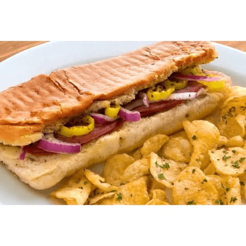 Combination of pepperoni, Genoa salami, capicola, house cheese blend, banana peppers, red onions, topped with our house vinaigrette dressing on a house-made roll. Additional toppings for extra cost. Served with a bag of potato chips.