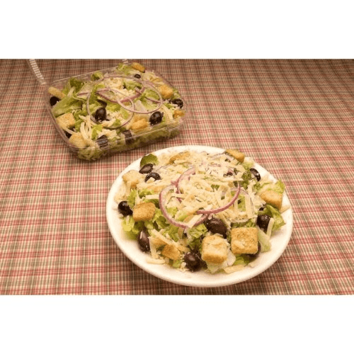 Romaine lettuce, red onions, kalamata black olives, parmesan cheese, croutons, Caesar dressing.