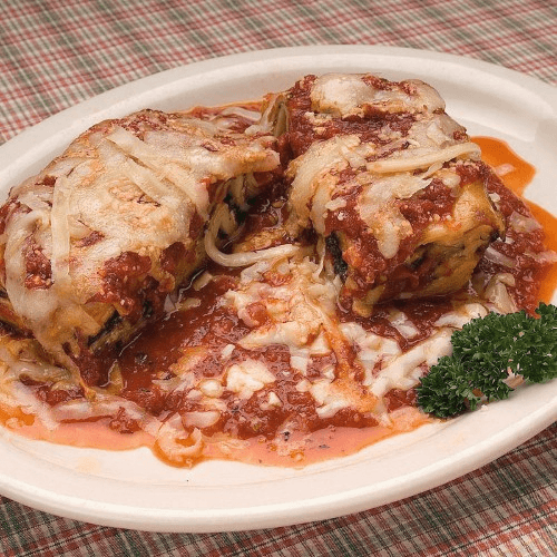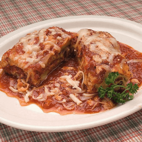 A combination of ground beef, Italian sausage and herbs, layered with our house cheese blend, ricotta and topped with our house-made pasta sauce. Frozen, cook before eating. See baking instructions on product packaging.