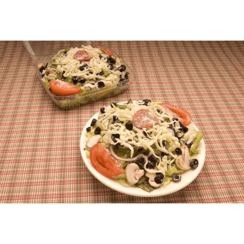 Our house lettuce blend, tomatoes, fresh mushrooms, red onions, green peppers, black olives, pepperoni, our house cheese blend, pecorino Romano cheese, house-made vinaigrette dressing.
