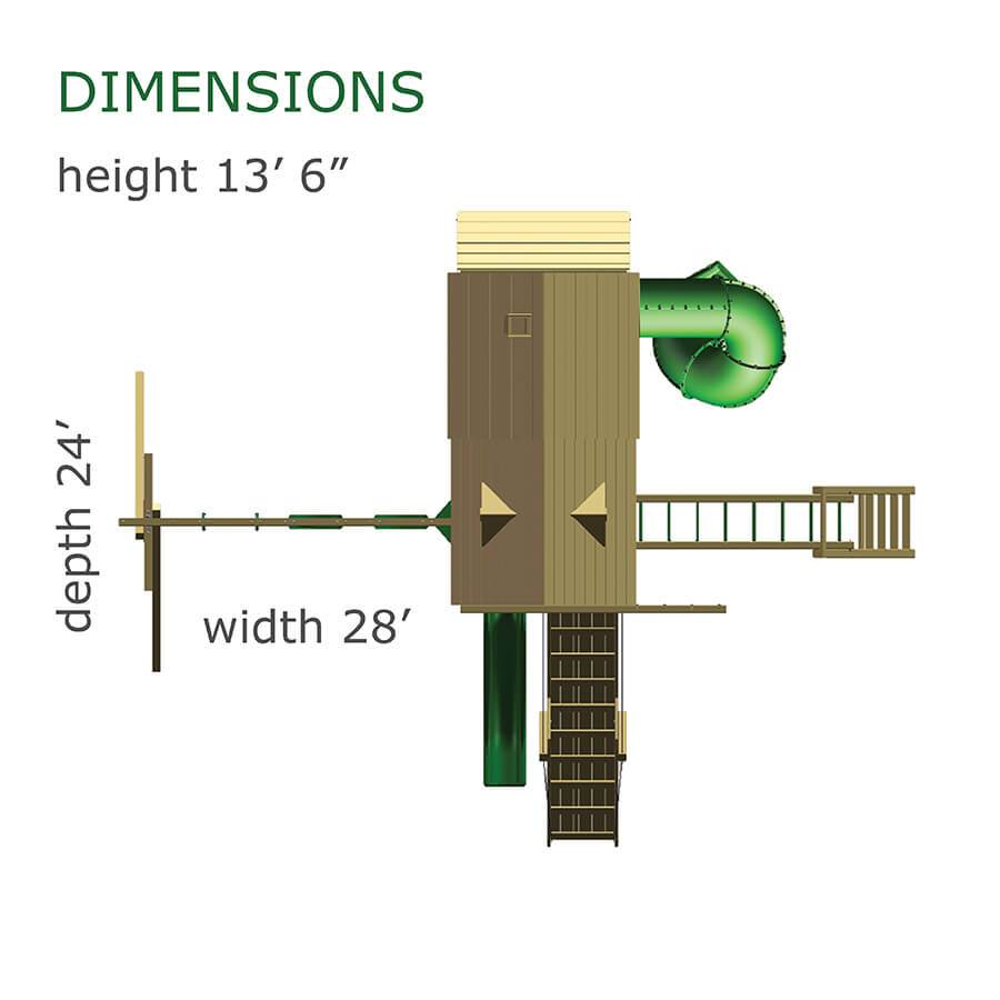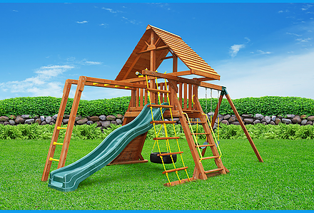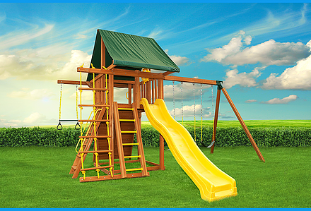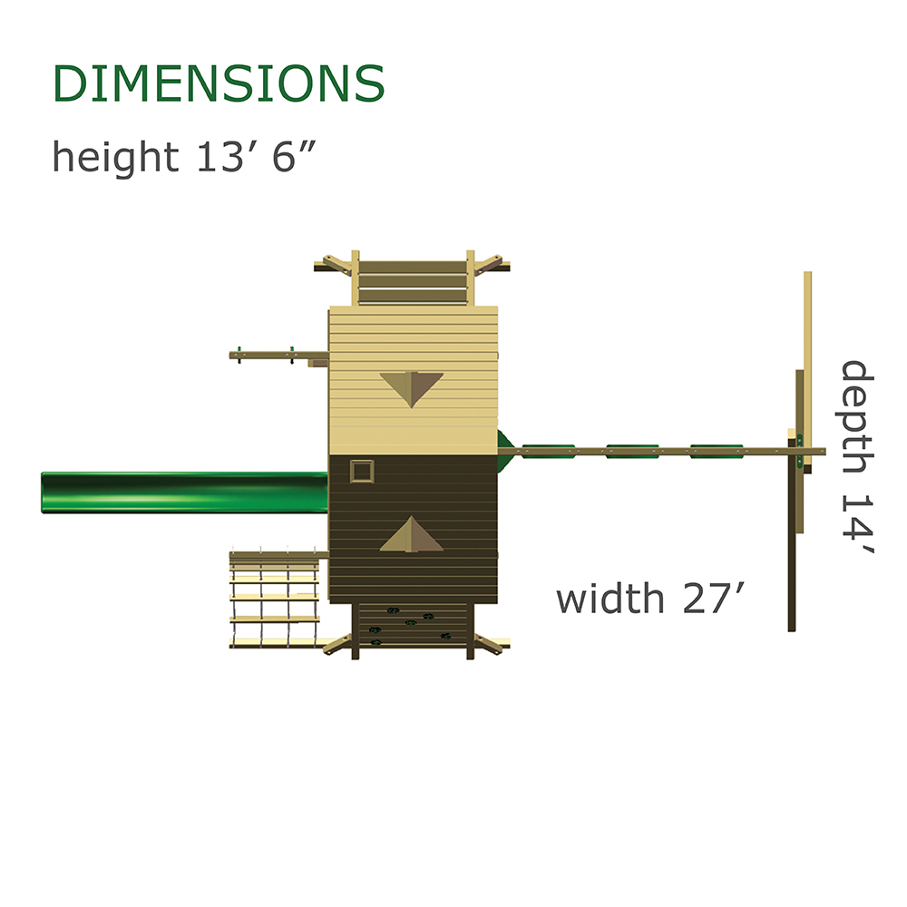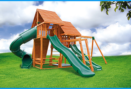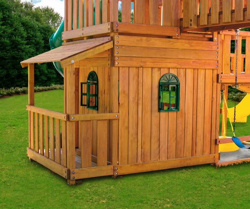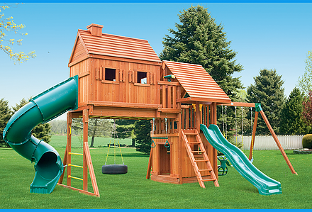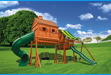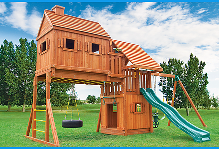 Less work, more play! Discover exciting adventures with the swing set that has it all. It has tons of play space and so many features it will keep your kids busy for hours! Hunter’s Hideaway is designed to create endless fun and imagination for the whole family. • Super Scoop Slide™ • Super Tube Slide™ • Swing Beam Positions – 3 • Belt Swings – 2 • Trapeze Swing • 360° Turbo Tire Swing™ with Swivel • Tic-Tac-Toe Panel • Steering Wheel • PlayTelescope • Dinner Bell • Deluxe Rope Ladder • Deluxe Climbing Ramp with Metal Grab Handles • Deluxe Monkey Bars with Metal Rungs • Porch • Sandbox Area • Clubhouse with a Floor, Door, and Working Shutters with Palladian Style Accents • Deluxe Tongue & Groove Wood Roofs • Roof Accents include Sunbursts, Chimney, and Dormers • Porch • Sandbox Area • Personalized Name Board • Flag Kit • Safety Handles • Available in Redwood and Cedar OR Stained Amber or Unstained Premium Preserved Pine • Lifetime Warranty* **FOR RESIDENTIAL USE ONLY**
