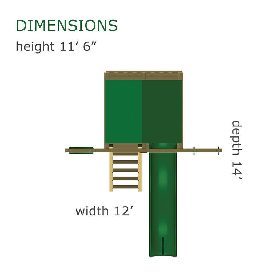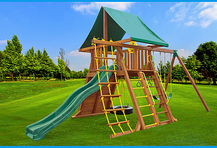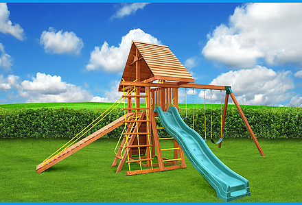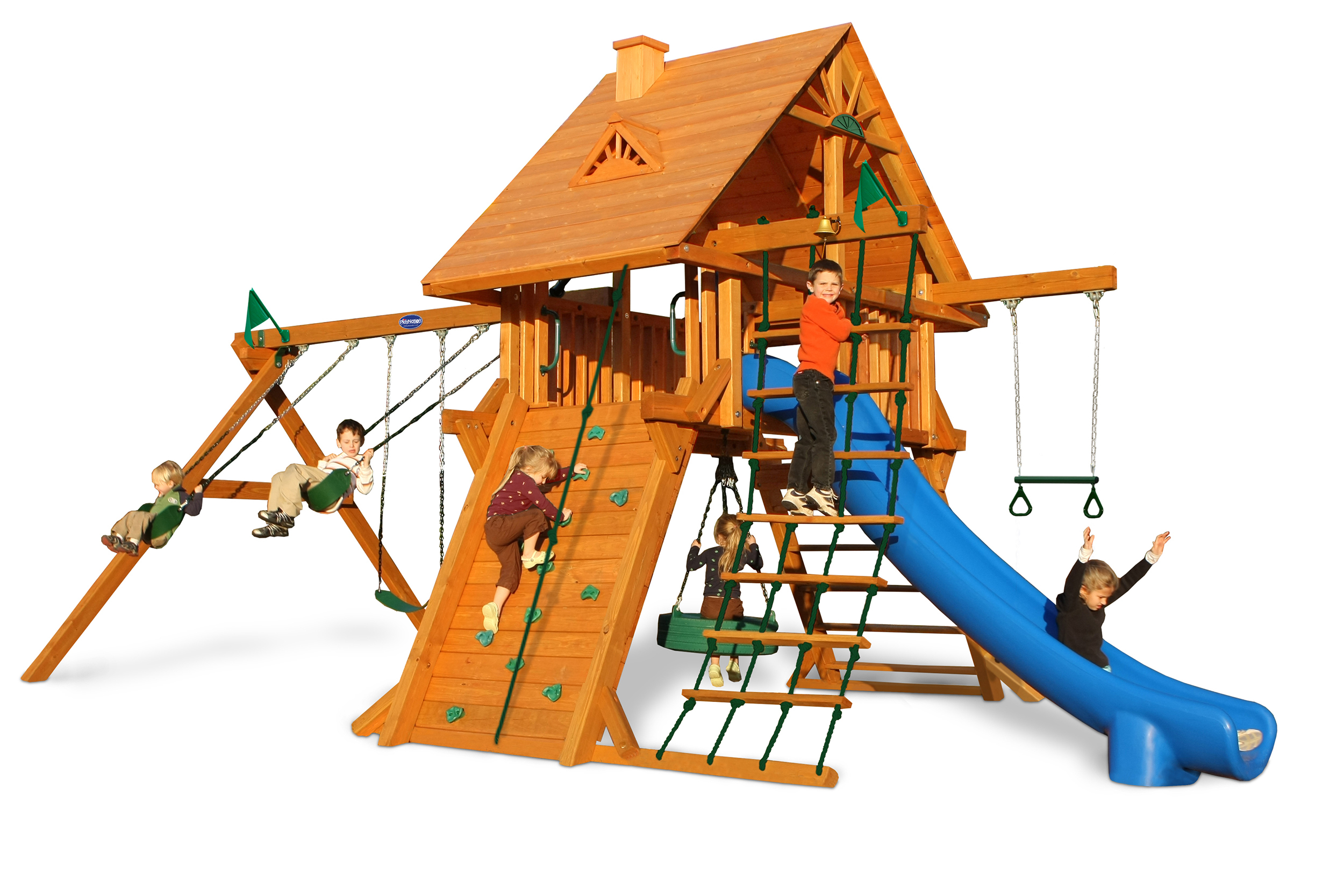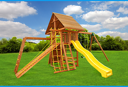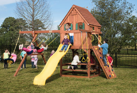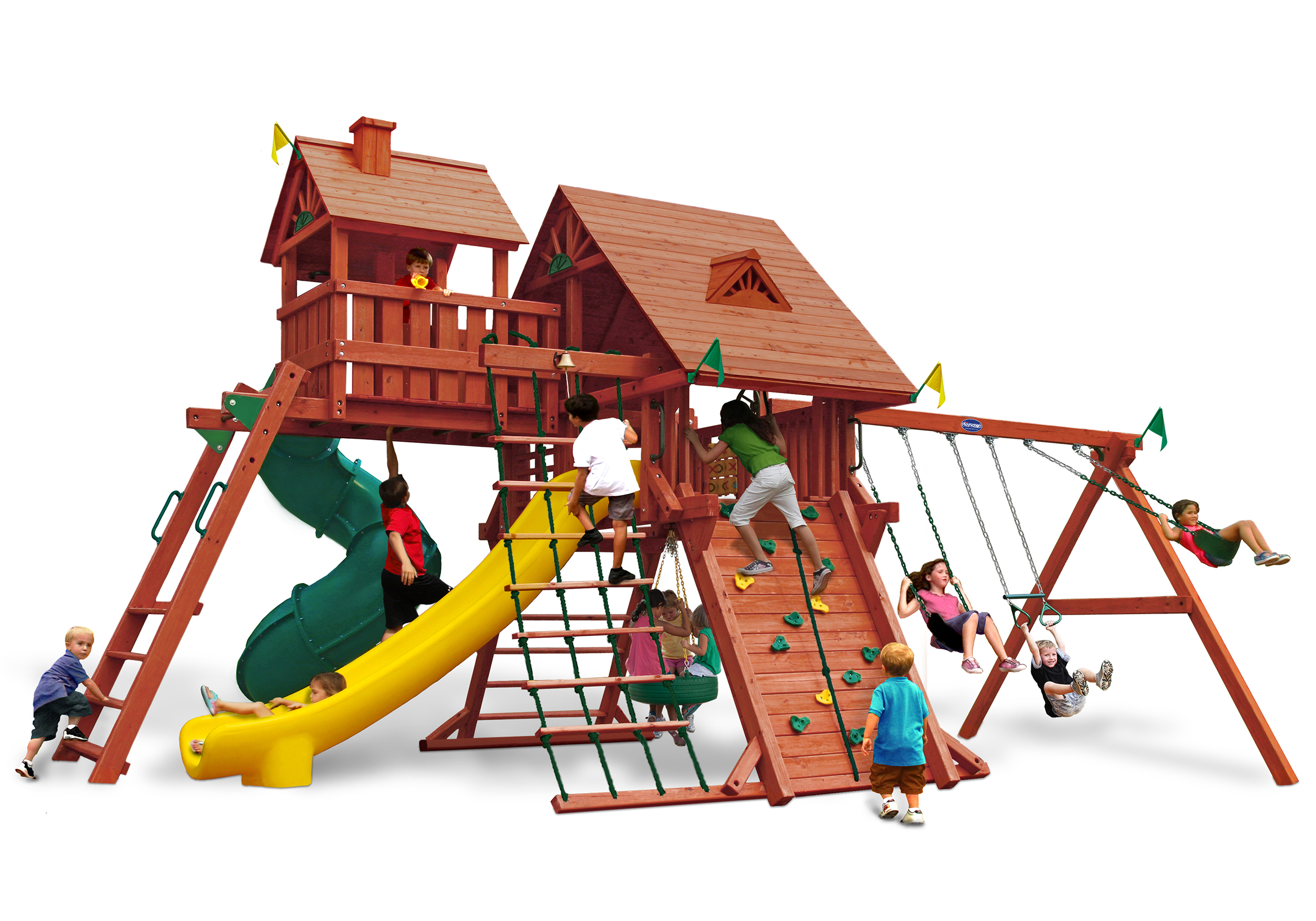 Less work, more play! Discover exciting adventures with the swing set that has it all. It has tons of play space and so many features it will keep your kids busy for hours! Hunter’s Hideaway is designed to create endless fun and imagination for the whole family. • Super Scoop Slide™ • Super Tube Slide™ • Swing Beam Positions – 3 • Belt Swings – 2 • Trapeze Swing • 360° Turbo Tire Swing™ with Swivel • Tic-Tac-Toe Panel • Steering Wheel • PlayTelescope • Dinner Bell • Deluxe Rope Ladder • Deluxe Climbing Ramp with Metal Grab Handles • Deluxe Monkey Bars with Metal Rungs • Porch • Sandbox Area • Clubhouse with a Floor, Door, and Working Shutters with Palladian Style Accents • Deluxe Tongue & Groove Wood Roofs • Roof Accents include Sunbursts, Chimney, and Dormers • Porch • Sandbox Area • Personalized Name Board • Flag Kit • Safety Handles • Available in Redwood and Cedar OR Stained Amber or Unstained Premium Preserved Pine • Lifetime Warranty* **FOR RESIDENTIAL USE ONLY**