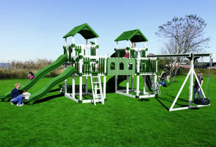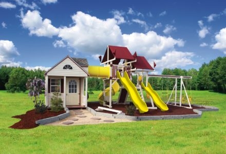 This is the perfect playset for your little prince or princess. The Castle playhouse connects to a tower and bridge, providing an ideal vantage point to survey the kingdom. The ten foot wave slide, belt swing, trapeze, plastic glider, and picnic table add an element of noble fun. Dimensions 23’w x 20’d x 10’6″h Weight 2,416 lbs. Tower 5′ x 5′ deck, 6′ x 8′ base, 5′ x 6′ playhouse with 3′ x 6′ porch, vinyl siding, blue shingles, 2 windows with screens & shutters Deck Height (2) 5′ Access 2 flat step ladder with access railing Roof 5′ x 5′ pyramid Connector 8′ bridge with rope Slide 10′ wave slide Swing Beam 3 position climber Swings plastic glider, trapeze, belt swing Anchors 2 Accessories 5′ x 6′ picnic table Border∗ 110′ landscape timber Mulch∗ 3 ton rubber mulch 13 cubic yds. wood mulch. Warranty: Limited Lifetime, 20-Year and 5-Year Warranty Subject to ordinary residential use and proper installation by a certified SK installer. Swing Kingdom warrants to the original purchaser at the original installation address, that the structural components of the playground systems, such as the PVC plastic lumber and wood components are covered by a 20-year warranty. In addition all canopies, slides, metal components, swings and accessories are warranted for 5 years from date of original purchase. Swing Kingdom’s products are not warranted as being suitable for a particular purpose. The suitability of the product is for the purchaser to determine. This warranty does not cover normal wear and tear, failure to properly maintain the product, or damage resulting from misuse or abuse of the product, additionally any acts of nature such as lightning, storms, hurricanes, tornados, earthquakes or any extreme weather conditions. Also any alteration, addition or relocation of the product will void this warranty. Swing Kingdom reserves the right to examine photographs and/or physical evidence of the product claimed to be defective, and to recover product prior to any warranty claims. All products returned for inspection must be sent freight prepaid. In the event of a defect covered by these warranties, Swing Kingdom will remedy the defect within a reasonable time. The remedy will consist of repair or replacement of the defective piece unless it is not practical. Then Swing Kingdom will reimburse the original purchaser for the value of the defective piece. (All freight cost of replacement parts are not cover under warranty and will be the purchaser responsibility to cover) Adult supervision is recommended while enjoying your play system. For safety and comfort reasons, Swing Kingdom reserves the right to make design & construction changes without notice.