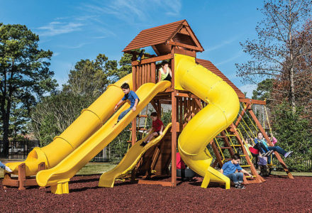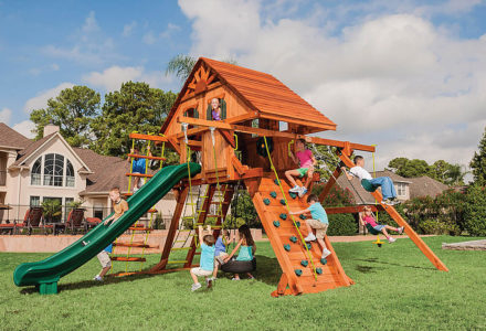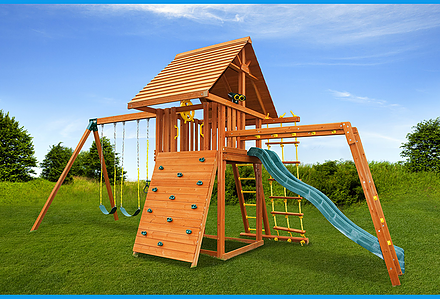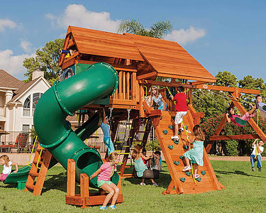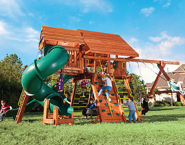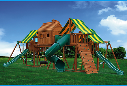 From scaling a rope ladder to sliding down a tube slide, the Royal Crusoe’s Treehouse has everything a kid desires. Kids can eat lunch on their own picnic table and swing on the tire swing. Of course, the parents are welcome to join in on the fun too! • Safe Entry Ladder with Metal • Grab Handles • Super Wave Scoop Slide™ • Super Tube Slide™ • Rock Wall with Rope and • Metal Grab Handles • Belt Swings – 2 • Trapeze Swing • 360° Turbo Tire Swing™ with Swivel • Deluxe Rope Ladder • Tic-Tac-Toe Panel • Chalkboard Kit • Built-In Picnic Table • Sandbox • Steering Wheel • Play Telescope • Dinner Bell • Extended Height Roofs • Swing Beam Positions – 3 • Available with Heavy-Duty Vinyl Canopy or Deluxe Wood Roof • Available in Redwood Stain and Cedar OR Stained Amber or Unstained Premium Preserved Pine • Lifetime Warranty* **FOR RESIDENTIAL USE ONLY**