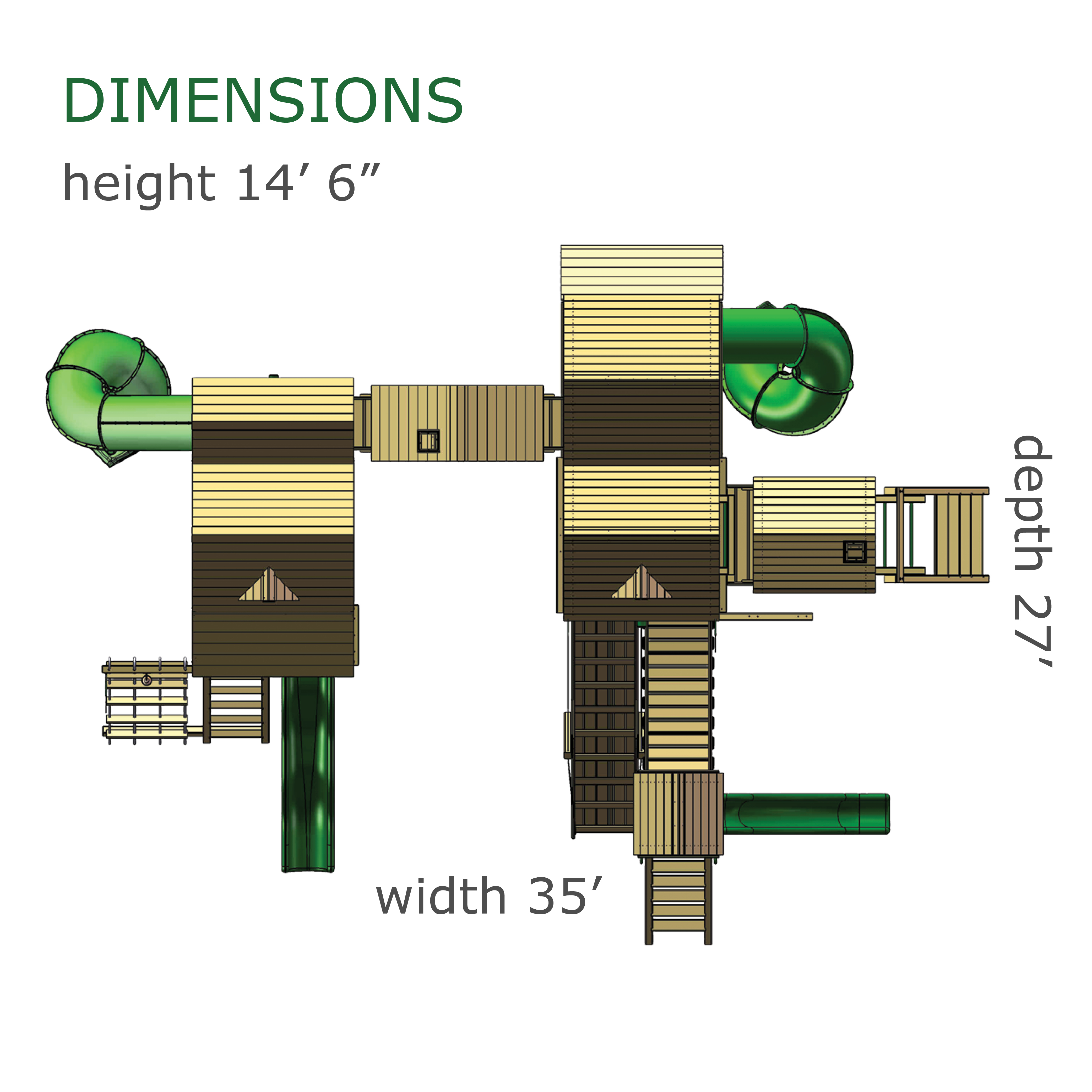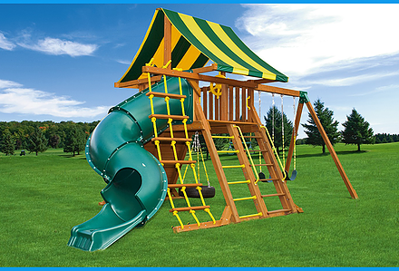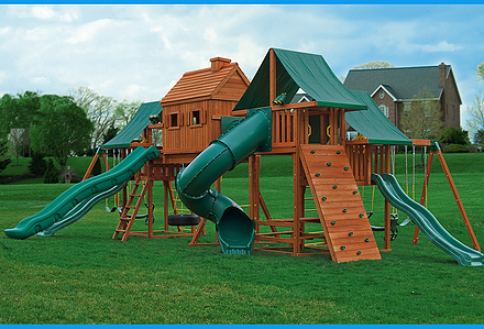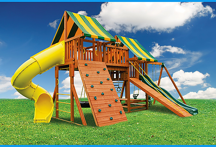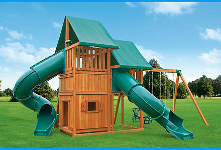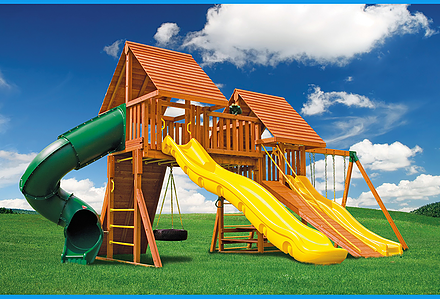 Treasure Trove II Swing Set is a spot for fun in your own backyard with The Reserve II! This huge swing set has it all – two covered play decks, a clatter bridge and tower – plus THREE slides! Imaginations will be in overdrive when they’re playing with all of the added accessories. Select from our wood roofs, classic vinyl canopies, our authentic Sunbrella® canopies, or our Malibu Wood Roof. • Wiki Wave Slide™ • Radical Ride 7’ Tube Slide™ • Commercial Grade Super Scoop Slide™ • Clatter Bridge & Tower • Rock Wall with Climbing Rope • Safe Entry Ladder • Deluxe Rope Ladder • Belt Swing • Trapeze Swing • Tandem Swing designed for 1 or 2 riders • Built-In Picnic Table • Sandbox • Bonus Sandbox under Tower • Tic-Tac-Toe Panel • Steering Wheel • Play Telescope • Deluxe Green Vinyl Canopy covering Platform and Tower • 4×4 Maintenance-free Timber Shield™ Posts & Main Beams • 4×6 3-Position Maintenance-free Timber Shield™ Swing Beam • Patented One-Piece A-Frame Bracket • Available in Cedar with a beautiful Amber Finish • 15 Year Limited Warranty on Lumber, 1 Year on Accessories **FOR RESIDENTIAL USE ONLY**