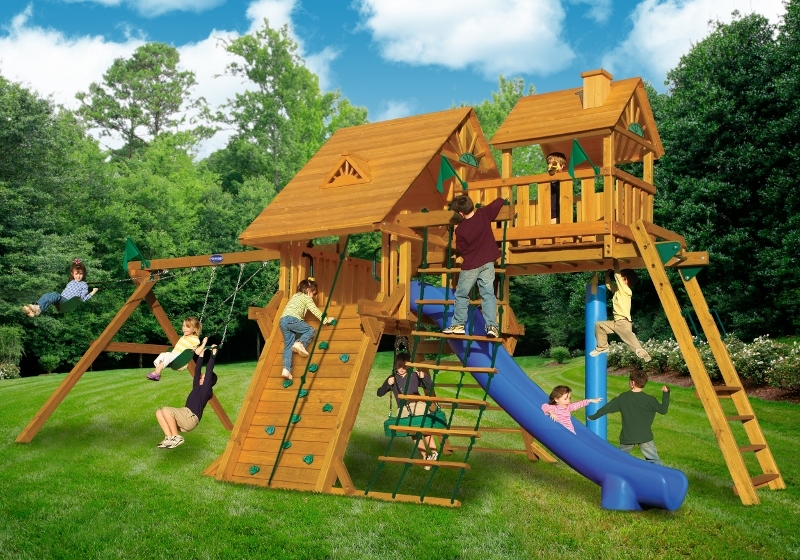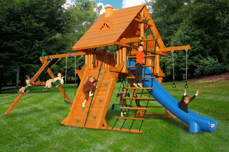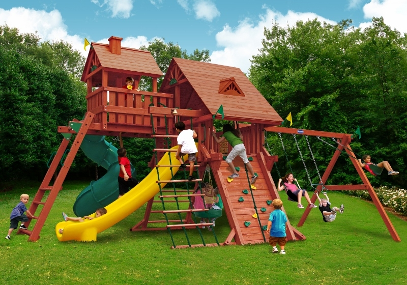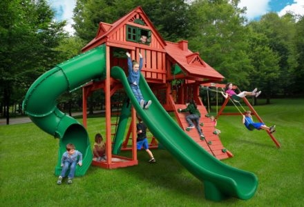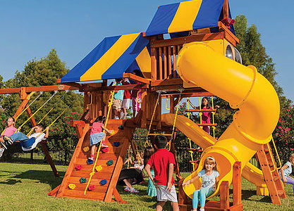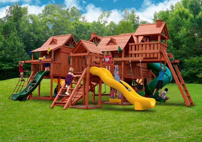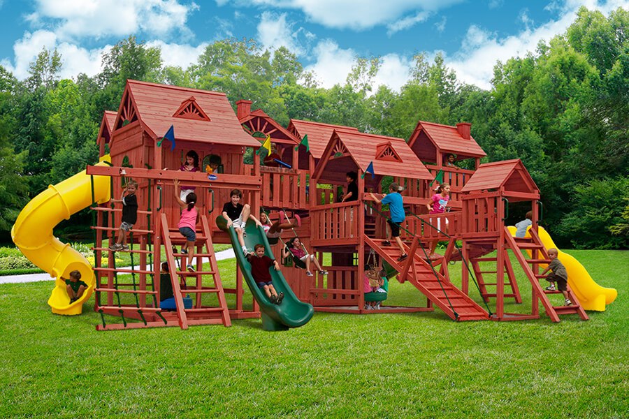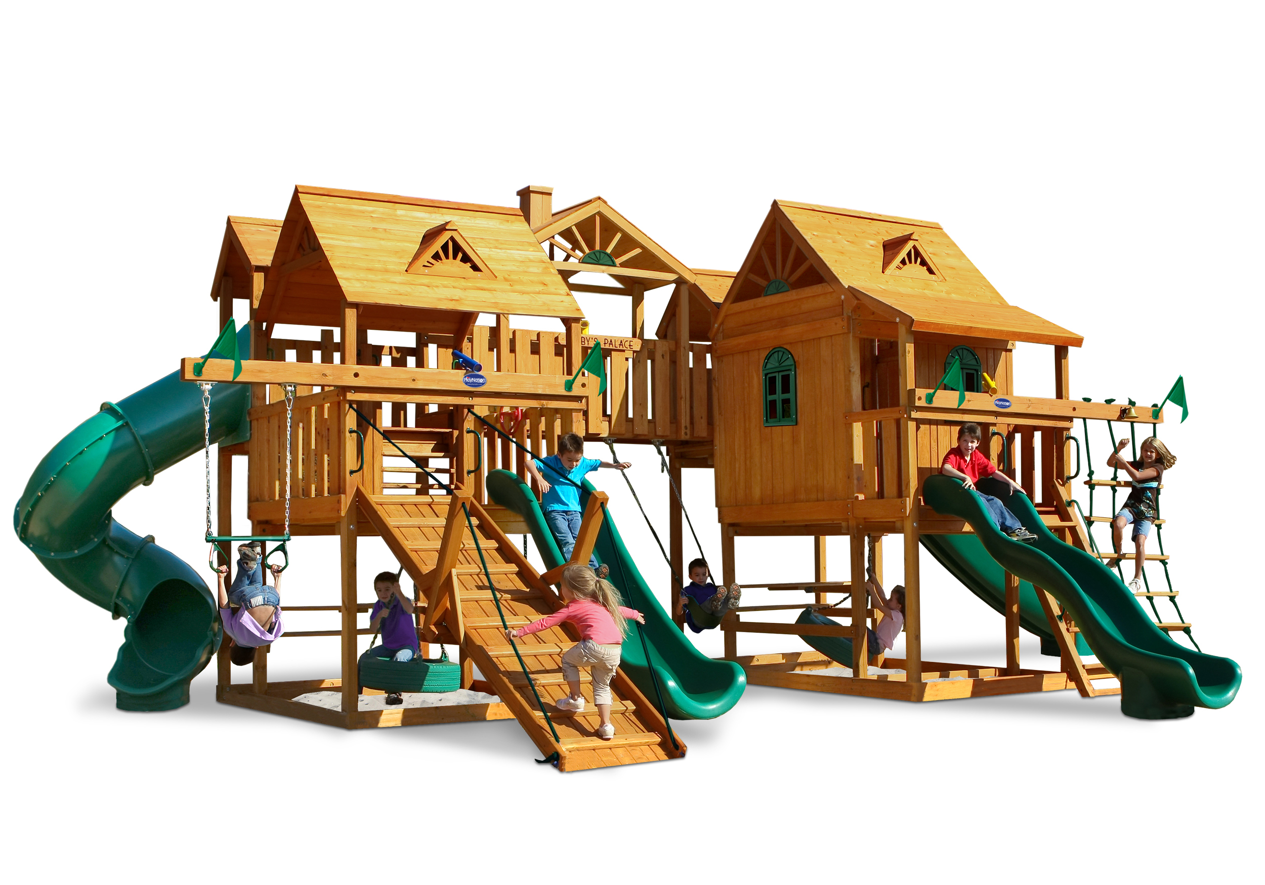 When was the last time you had this much fun? Abby’s Palace was designed for big families and big yards. With over 130 square feet of play decks, 4 slides and tons of activities, there is no doubt that this swing set will bring the family together, creating wonderful memories for years to come. You’ll have the biggest swing set on your block! • Several Multi Level Platforms • Over 130 Square Feet of Play Decks! • Safe Entry Ladder with Metal Safety Handles • Deluxe Tongue & Groove Wood Roofs • Roof Accents Include Sunbursts, Dormers and a Chimney • Clubhouse with a Door and Working Shutters with Palladian Style Accents • Deluxe Climbing Ramp and Rope Ladder • Super Scoop Slide™ – 2 • Super Scoop Wave Slide™ • Super Tube Slide™ • Belt Swings – 2 • Trapeze Arm with Trapeze Swing • Picnic Tables – 2 • Sandboxes – 2 • 360° Turbo Tire Swings™ with Swivels – 2 • Steering Wheel • Telescopes – 2 • Periscope • Dinner Bell • Flag Kit • Flower Box • Safety Handles • Personalized Name Plate • Available in Redwood Stain and Cedar OR Stained Amber or Unstained Premium Preserved Pine • Lifetime Warranty* **FOR RESIDENTIAL USE ONLY**