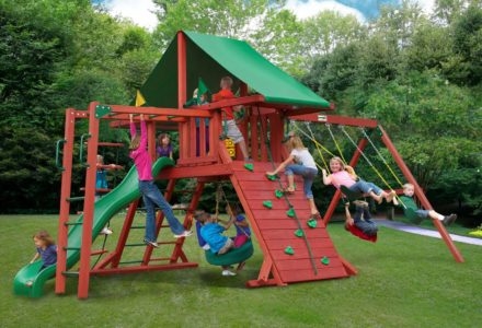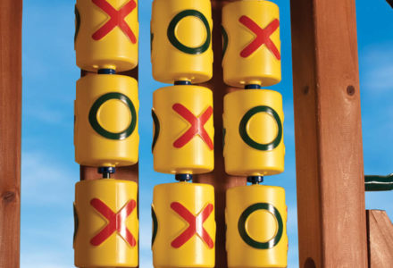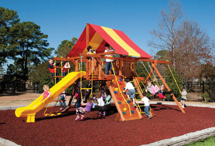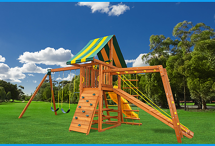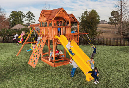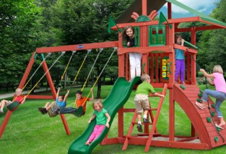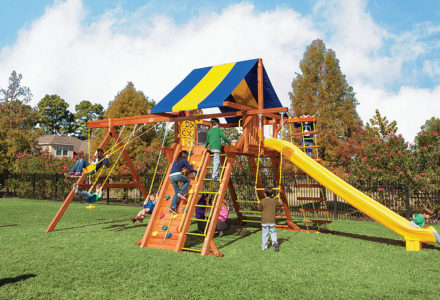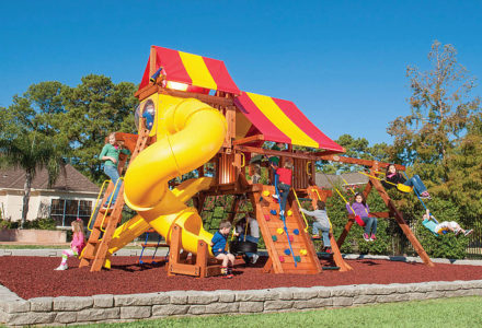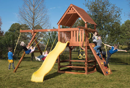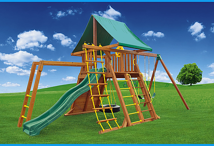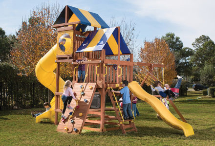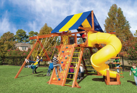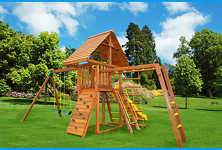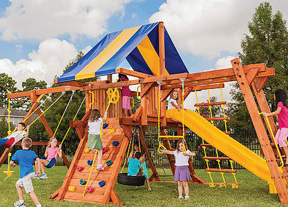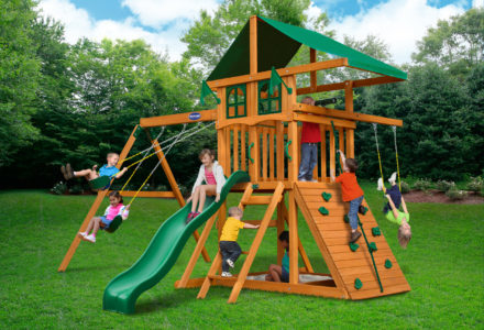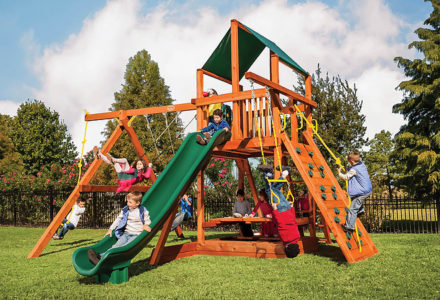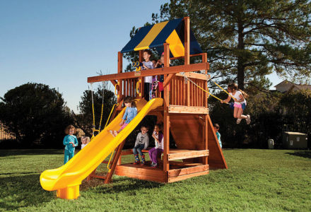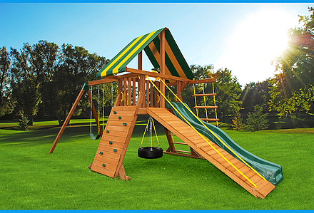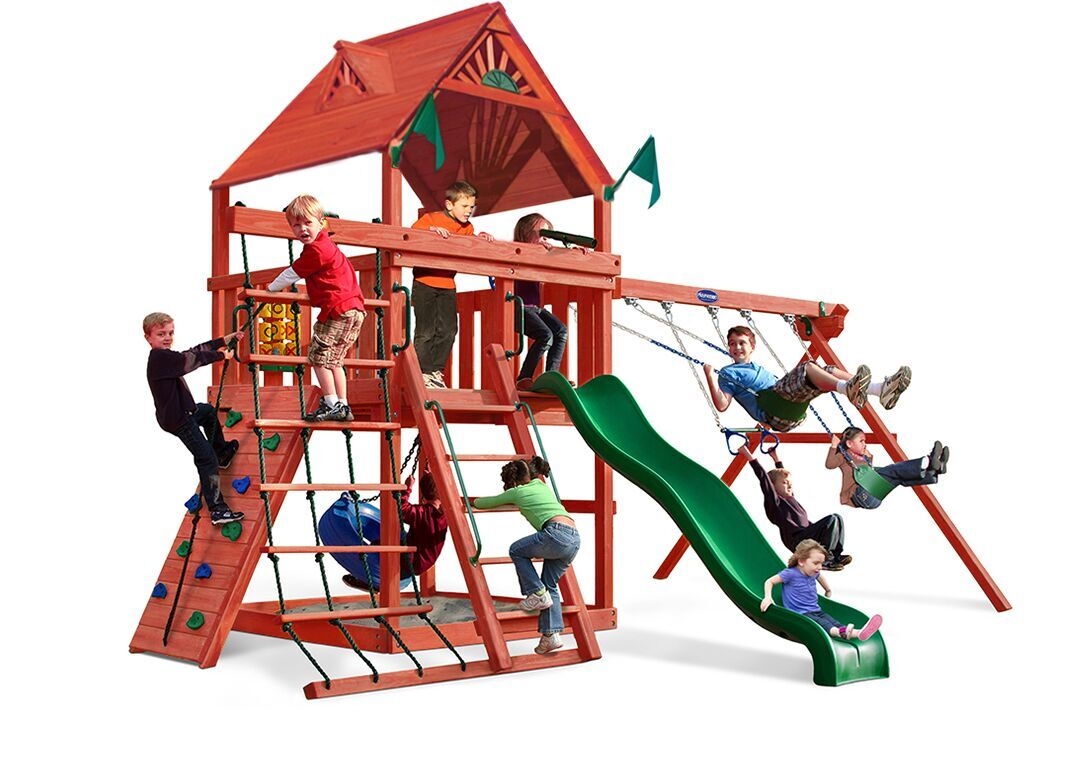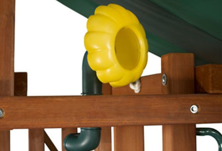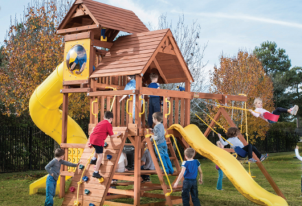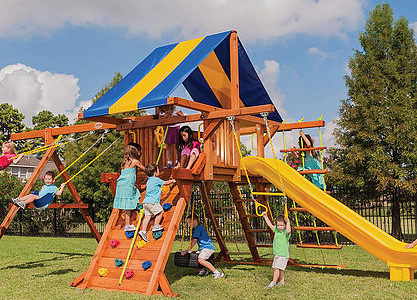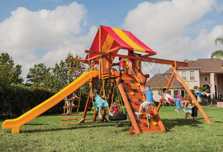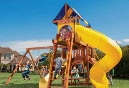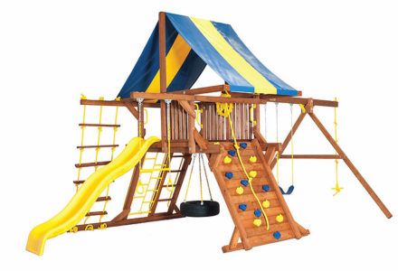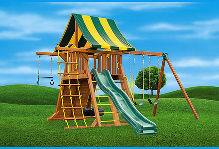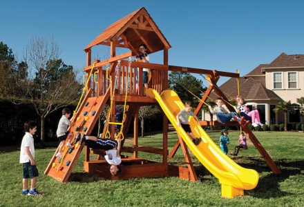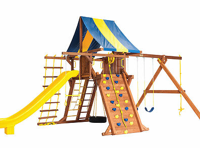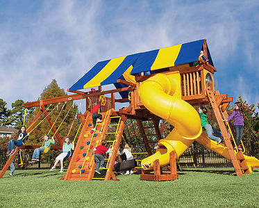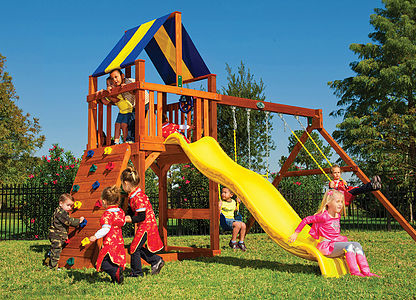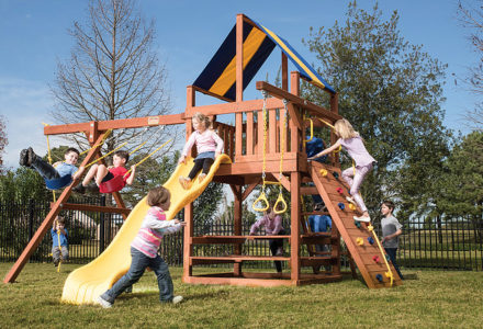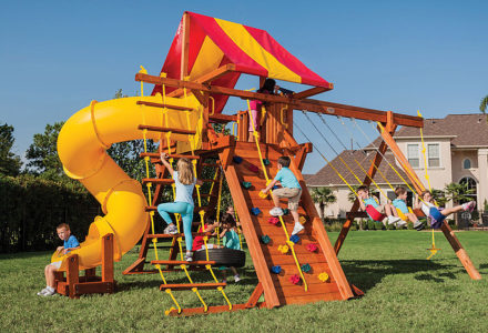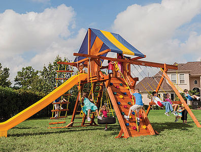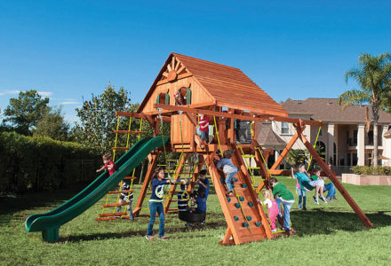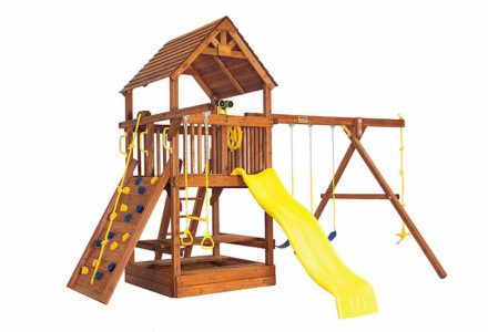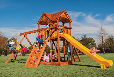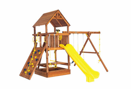 You may have to charge admission, as all the kids in the neighborhood will want to play on this monster swing set! From it’s extended height swing beam and extra large play deck, to the huge rock wall, this swing set begs to be climbed on. • Safe Entry Ladder with Metal Safety Handles • Super Scoop Slide™ • 360° Turbo Tire Swing™ with Swivel • Tic-Tac-Toe Panel • Steering Wheel • Play Telescope • Dinner Bell • Extended Height Swing Beam • Swing Beam Positions – 3 • Belt Swings – 3 • Rock Wall with Climbing Rope and Metal Safety Handles • Trapeze Arm with Trapeze Swing • Heavy-Duty 4” x 6” Swing Legs • Heavy-Duty Vinyl Canopy • Flag Kit • Safety Handles • Available in Redwood Stain and Amber Stain • Lifetime Warranty* **FOR RESIDENTIAL USE ONLY**