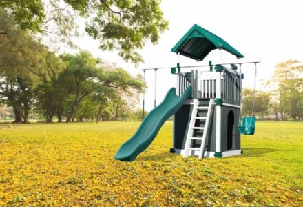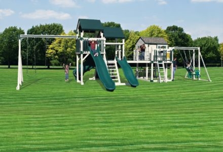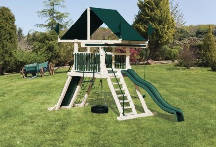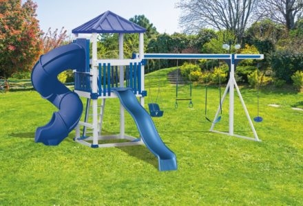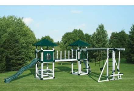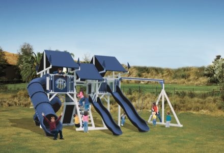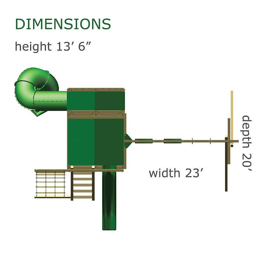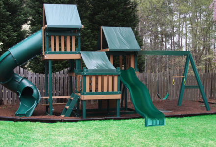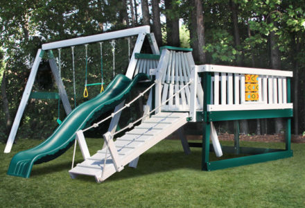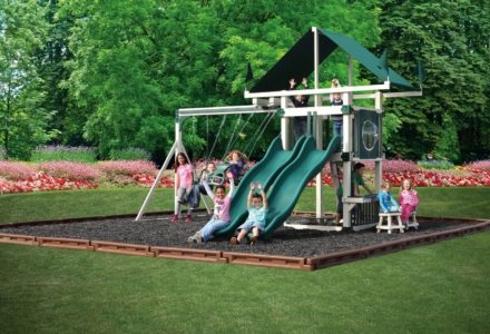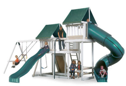 Whether your child is a thrill seeker or is simply seeking a space to unwind, this playset will suit their disposition. The turbo twister and the ten foot avalanche slide inspire hours of active play, while the hammock swing offers an ideal escape for lazy summer afternoons. This playset is also nicely equipped with a five foot rock wall, cargo net, trapeze, belt swing, rubber infant swing, and three-rope tire swing. Dimensions 24’w x 18’d x 12′ h Weight 1,380 lbs. Tower 5′ x 5′ deck Deck Height 5′ with 7′ Landing Access flat step ladder with hand rail Roof gable roof Climber 5′ rock wall with rope, cargo net Slide 10′ avalanche slide, turbo twister slide Swing Beam 4 position single beam Swings hammock swing, trapeze, belt swing, rubber infant swing, three-rope tire swing Anchors 2 Accessories ship’s wheel Border∗ 116′ landscape timber Mulch∗ 3 ton rubber mulch 15 cubic yds. wood mulch. Warranty: Limited Lifetime, 20-Year and 5-Year Warranty Subject to ordinary residential use and proper installation by a certified SK installer. Swing Kingdom warrants to the original purchaser at the original installation address, that the structural components of the playground systems, such as the PVC plastic lumber and wood components are covered by a 20-year warranty. In addition all canopies, slides, metal components, swings and accessories are warranted for 5 years from date of original purchase. Swing Kingdom’s products are not warranted as being suitable for a particular purpose. The suitability of the product is for the purchaser to determine. This warranty does not cover normal wear and tear, failure to properly maintain the product, or damage resulting from misuse or abuse of the product, additionally any acts of nature such as lightning, storms, hurricanes, tornados, earthquakes or any extreme weather conditions. Also any alteration, addition or relocation of the product will void this warranty. Swing Kingdom reserves the right to examine photographs and/or physical evidence of the product claimed to be defective, and to recover product prior to any warranty claims. All products returned for inspection must be sent freight prepaid. In the event of a defect covered by these warranties, Swing Kingdom will remedy the defect within a reasonable time. The remedy will consist of repair or replacement of the defective piece unless it is not practical. Then Swing Kingdom will reimburse the original purchaser for the value of the defective piece. (All freight cost of replacement parts are not cover under warranty and will be the purchaser responsibility to cover) Adult supervision is recommended while enjoying your play system. For safety and comfort reasons, Swing Kingdom reserves the right to make design & construction changes without notice.