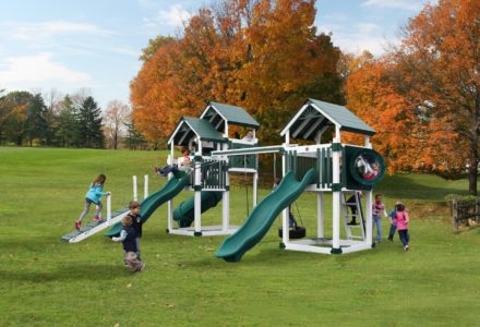 The Tunnel Escape playset is big fun. Children can climb the flat step ladder to the playhouse, where the steering wheel is waiting for a spin. Then, exit down the avalanche slide or navigate the tower tunnel. They can use the periscope to check out their surroundings, or peak through the bubble panel before racing down the turbo twister slide. Also included are a picnic table, sandbox, horse rider, basket glider, trapeze and belt swing. The Tunnel Escape playset is like an amusement park in your own backyard. Dimensions 38’w x 17’d x 13’h Weight 3,416 lbs. Tower 5′ x 9′ double, 6′ x 8′ base, 5′ x 6′ playhouse with 3′ x 6′ porch, vinyl siding, weatherwood shingles, 2 windows with screens & shutters Deck Height 5′, 7′ Access (2) flat step ladder with access railing Roof 5′ x 5′ vinyl with sunrise Connector 6’6″ tower tunnel, 6’6″ bridge with railing Slide 10′ avalanche slide, turbo twister slide Swing Beam 4 position single beam Swings baby swing, trapeze, (2) belt swing Anchors 2 Accessories 5′ x 5′ picnic table, bubble panel, telescope, ship’s wheel Border∗ 142′ landscape timber Mulch∗ 4 ton rubber mulch 22 cubic yds. wood mulch. Warranty: Limited Lifetime, 20-Year and 5-Year Warranty Subject to ordinary residential use and proper installation by a certified SK installer. Swing Kingdom warrants to the original purchaser at the original installation address, that the structural components of the playground systems, such as the PVC plastic lumber and wood components are covered by a 20-year warranty. In addition all canopies, slides, metal components, swings and accessories are warranted for 5 years from date of original purchase. Swing Kingdom’s products are not warranted as being suitable for a particular purpose. The suitability of the product is for the purchaser to determine. This warranty does not cover normal wear and tear, failure to properly maintain the product, or damage resulting from misuse or abuse of the product, additionally any acts of nature such as lightning, storms, hurricanes, tornados, earthquakes or any extreme weather conditions. Also any alteration, addition or relocation of the product will void this warranty. Swing Kingdom reserves the right to examine photographs and/or physical evidence of the product claimed to be defective, and to recover product prior to any warranty claims. All products returned for inspection must be sent freight prepaid. In the event of a defect covered by these warranties, Swing Kingdom will remedy the defect within a reasonable time. The remedy will consist of repair or replacement of the defective piece unless it is not practical. Then Swing Kingdom will reimburse the original purchaser for the value of the defective piece. (All freight cost of replacement parts are not cover under warranty and will be the purchaser responsibility to cover) Adult supervision is recommended while enjoying your play system. For safety and comfort reasons, Swing Kingdom reserves the right to make design & construction changes without notice.