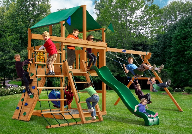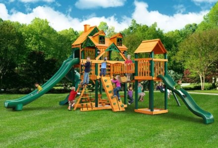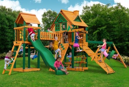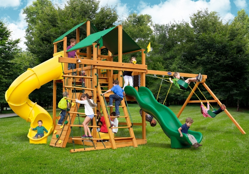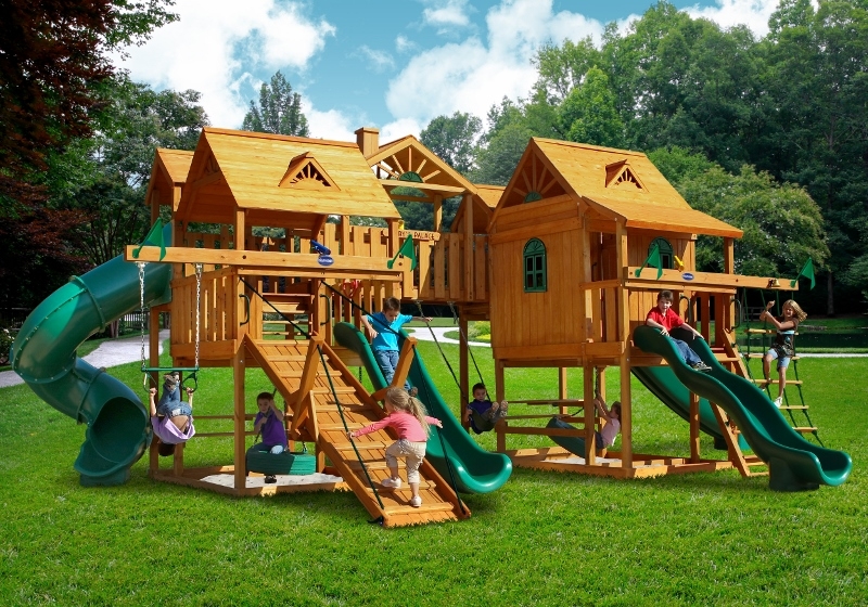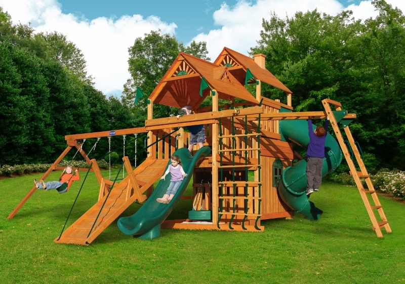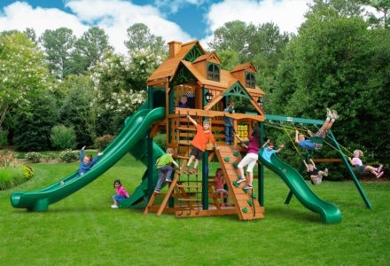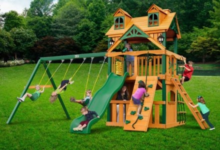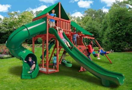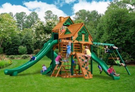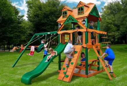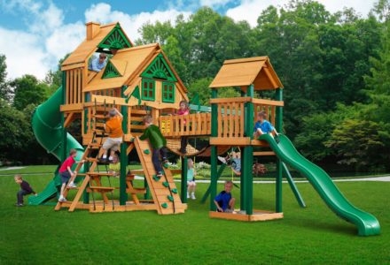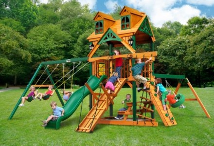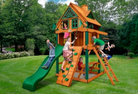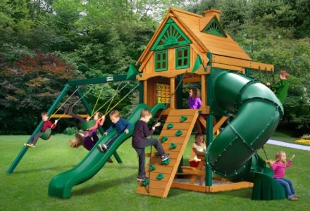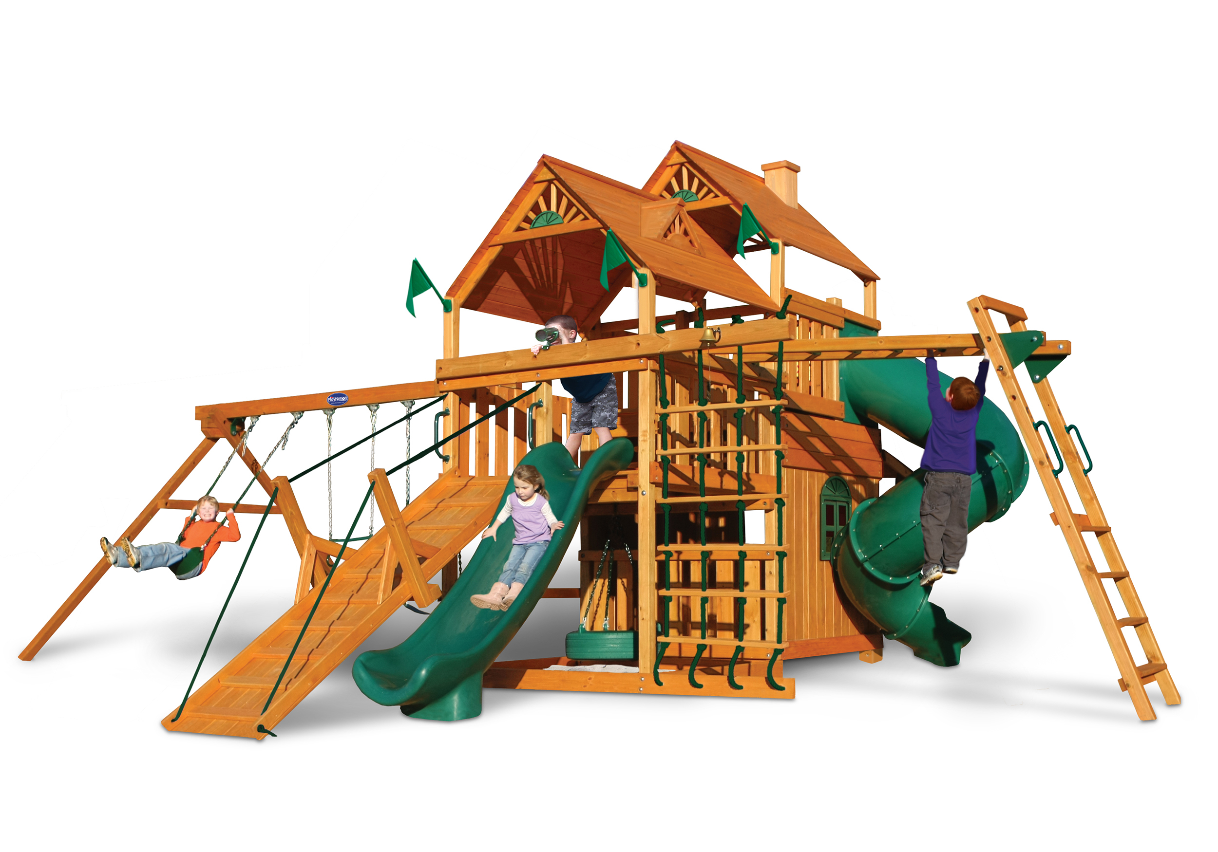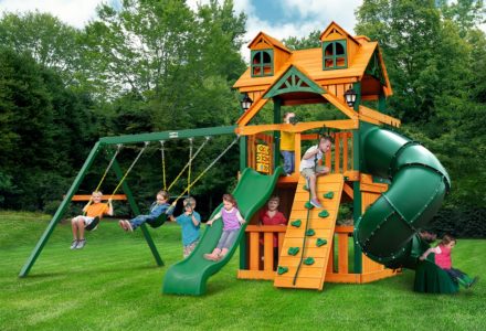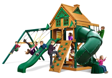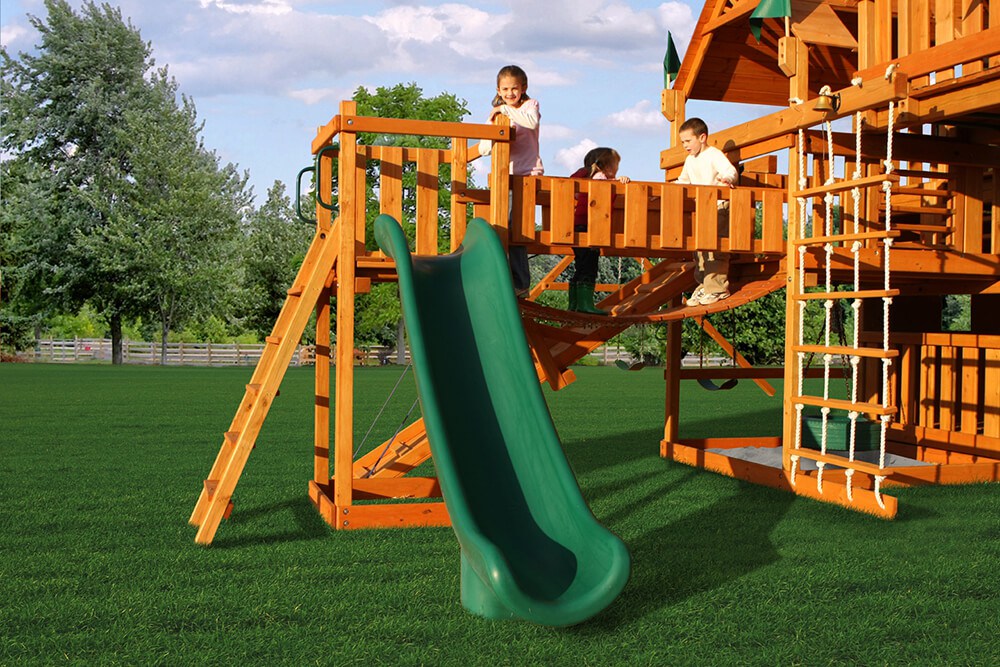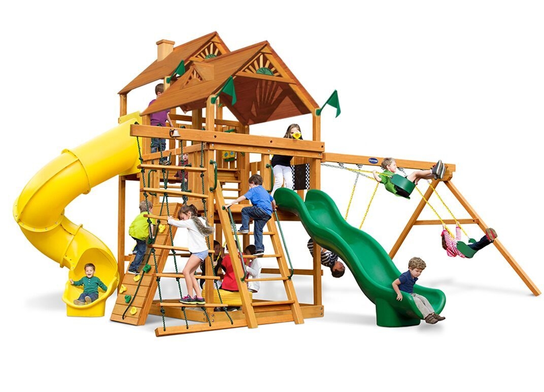 Let kids do what kids do best – PLAY! With not one, not two, but THREE slides, the Gorilla Playsets Great Skye II Treehouse Swing Set has it all. Things will never get boring with all of the accessories that are included, including a Deluxe Rope Ladder, Jumbo Play Binoculars and more! This set includes Tongue & Groove Wood Roofs featuring an Upper-Level Treehouse and working shutters. The main beams and posts are also available in maintenance-free Timber Shield™ OR Natural Cedar. Let the fun begin, order yours today! • Wiki Wave Slide™ • Radical Ride 7’ Tube Slide™ • Commercial Grade Super Scoop Slide™ • Rock Wall with Climbing Rope • Safe Entry Ladder • Deluxe Rope Ladder • Belt Swing • Trapeze Swing • Tandem Swing designed for 1 or 2 riders • Built-In Picnic Table • Sandbox • Tic-Tac-Toe Panel • Chalkboard Kit • Play Telephone • Jumbo Binoculars • Steering Wheel • Play Telescope • Available with Tongue & Groove Wood Roof featuring Dormers and a Chimney • Upper Level Treehouse with Working Shutters and a Sunburst • 4×4 Maintenance-free Timber Shield™ Posts & Main Beams • 4×6 3-Position Maintenancefree Timber Shield™ Swing Beam • Patented One-Piece A-Frame Bracket • Available in Cedar with a beautiful Amber Finish • 15 Year Limited Warranty on Lumber, 1 Year on Accessories **FOR RESIDENTIAL USE ONLY**