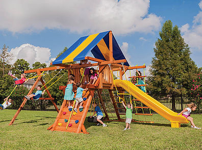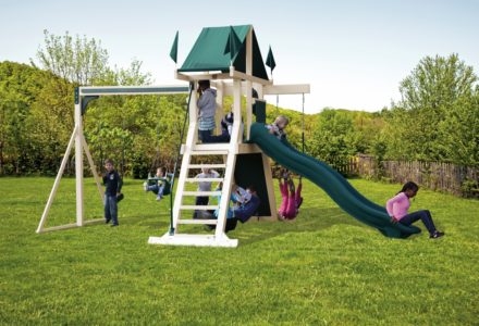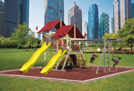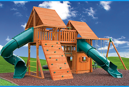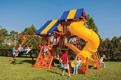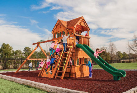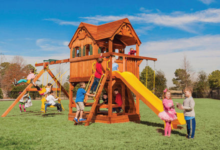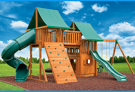 Fit for the future kings and queens in your family. Perfect for tea parties and other events of royal proportions. The Royal Palace is also very modular and can be added onto as the children grow. Plenty of space for Mom and Dad too! • Safe Entry Ladder with Extended Metal Grab Handles • Wiki Wave Slide™ • Rock Wall with Rope and Metal Grab Handles • Deluxe Rope Ladder • Belt Swings – 2 • Trapeze Swing • 360° Turbo Tire Swing™ with Swivel • Sandbox • Tic-Tac-Toe Panel • Chalkboard Kit • Steering Wheel • Play Telescope • Dinner Bell • Heavy-Duty Vinyl Canopy • Extended Roof Height • Swing Beam Positions – 3 • Available in Redwood Stain and Cedar OR Stained Amber or Unstained Premium Preserved Pine • Lifetime Warranty* **FOR RESIDENTIAL USE ONLY**
