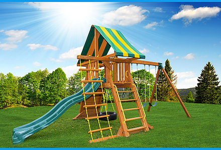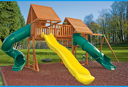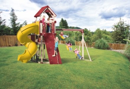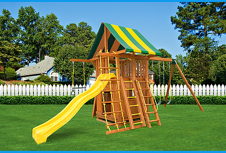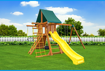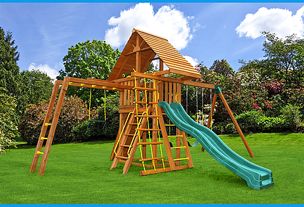 This swing set was built with your little princes and princesses in mind. Perfect for royal gatherings of the court. This unit is a great space saver filled with ballroom dreams and knight fantasies. With over 6′ of headroom, Mom and Dad can join in the fun. The perfect unit for small yards. • Safe Entry Ladder with Metal Grab Handles • Wiki Wave Slide™ • Rock Wall with Rope and • Metal Grab Handles • Extended Height Roof • Belt Swing • Trapeze Swing • 360° Turbo Tire Swing™ with Swivel • Sandbox • Steering Wheel • Tic-Tac-Toe Panel • Play Telescope • Swing Beam Positions – 2 • Heavy-Duty Vinyl Canopy • Available in Redwood Stain and Cedar OR Stained Amber or Unstained Premium Preserved Pine • Lifetime Warranty* **FOR RESIDENTIAL USE ONLY**
