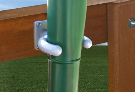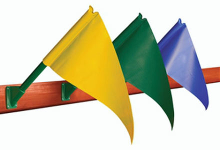Waving flags of fun! The flags are available in blue, green, or yellow, and all have a slightly glossy shine. Made from a thick canvas-like material, the flags have a protective texture on the back that adds extra strength in high winds. The flag is securely bound onto the flag pole, so that it fits tightly. Attaches to your swing set with 4 screws (included).