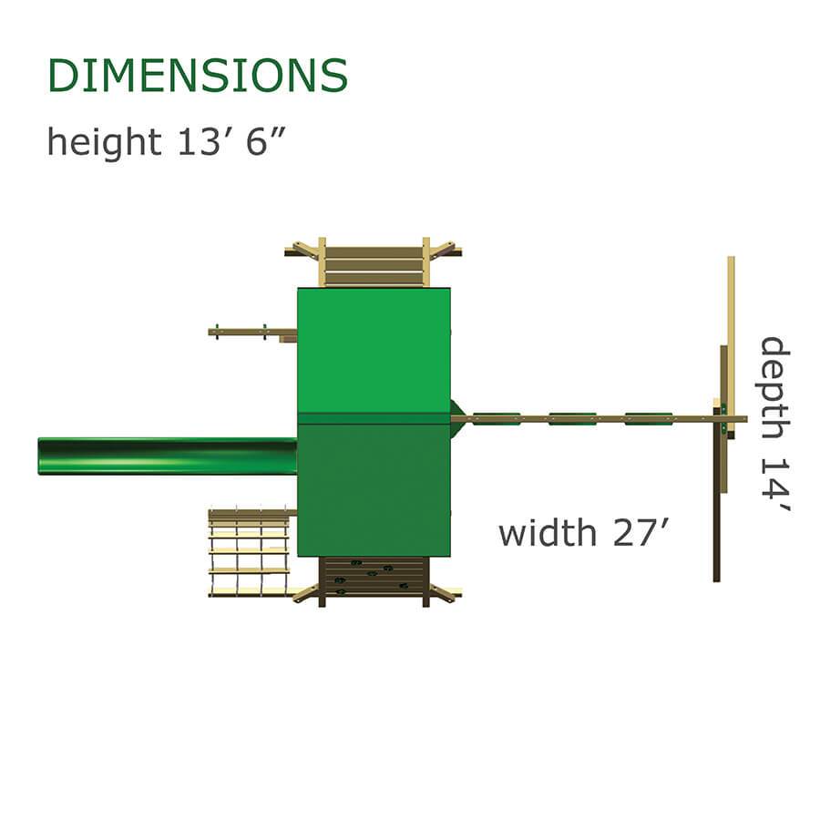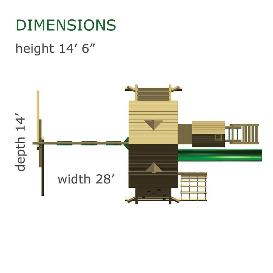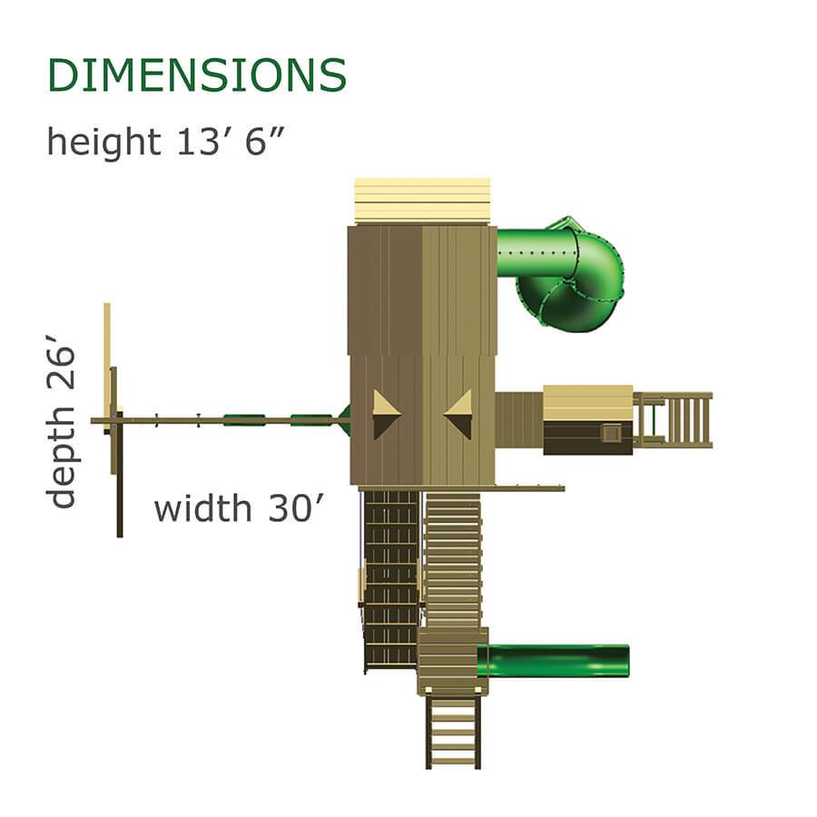 The Cliff Lookout swing set offers loads of fun and excitement. With three deck heights, and tons of tower access options, the sky’s the limit. Kids can climb the jungle bars, scramble up the rock wall, or run down the twelve foot ramp. While atop the towers, spin the steering wheel and keep an eye on things through the bubble panel, binoculars, or periscope. At the bottom of the avalanche slide, discover the clubhouse, tic-tac-toe board, picnic table, two belt swings and trapeze. With so many possibilities for fun, this playset will actively encourage kids to discover all the joys of the great outdoors. Dimensions 32’w x 22’d x 16′ h Weight 2,432 lbs. Tower 5′ x 9′ double with jungle bar tower Deck Height 5′, 7′, 9′ Access 12′ Ramp Roof (2) gable roof Climber 5′ rock wall with rope Slide 14′ avalanche slide, 9′ tunnel express slide Swing Beam 3 position single high beam Swings (2) belt swings, trapeze Anchors 2 Accessories 5′ x 5′ lower deck, 5′ x 5′ clubhouse, tic-tac-toe panel, steering wheel, bubble panel, periscope, fire pole, 4′ x 5′ picnic table Border∗ 140′ landscape timber Mulch∗ 4 ton rubber mulch 17 cubic yds. wood mulch Warranty: Limited Lifetime, 20-Year and 5-Year Warranty Subject to ordinary residential use and proper installation by a certified SK installer. Swing Kingdom warrants to the original purchaser at the original installation address, that the structural components of the playground systems, such as the PVC plastic lumber and wood components are covered by a 20-year warranty. In addition all canopies, slides, metal components, swings and accessories are warranted for 5 years from date of original purchase. Swing Kingdom’s products are not warranted as being suitable for a particular purpose. The suitability of the product is for the purchaser to determine. This warranty does not cover normal wear and tear, failure to properly maintain the product, or damage resulting from misuse or abuse of the product, additionally any acts of nature such as lightning, storms, hurricanes, tornados, earthquakes or any extreme weather conditions. Also any alteration, addition or relocation of the product will void this warranty. Swing Kingdom reserves the right to examine photographs and/or physical evidence of the product claimed to be defective, and to recover product prior to any warranty claims. All products returned for inspection must be sent freight prepaid. In the event of a defect covered by these warranties, Swing Kingdom will remedy the defect within a reasonable time. The remedy will consist of repair or replacement of the defective piece unless it is not practical. Then Swing Kingdom will reimburse the original purchaser for the value of the defective piece. (All freight cost of replacement parts are not cover under warranty and will be the purchaser responsibility to cover) Adult supervision is recommended while enjoying your play system. For safety and comfort reasons, Swing Kingdom reserves the right to make design & construction changes without notice.