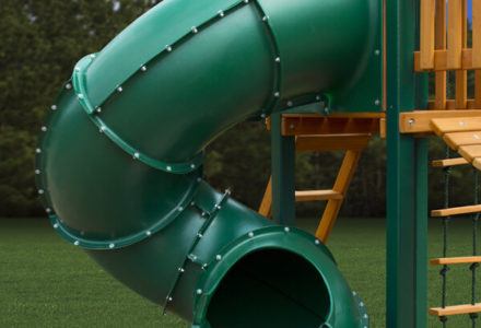 This set is a deluxe treat for your backyard. With so many activities to offer, your children will be busy all afternoon long! They’ll be zooming down the two slides, twirling around on the tire swing, and swinging the day away for hours. Select from our classic vinyl canopy or our Sunbrella® canopy. • 1st Level Platform – 4′ x 6′ • Height – 5′ • 2nd Level Platform – 5′ x 5.5′ • Height – 7′ • Commercial Grade 14′ Super • Scoop Slide™ • Radical Ride 7’ Tube Slide™ • Rock Wall with Climbing Rope • Deluxe Rope Ladder • Combo Safe Entry Ladder & Metal • Rung Ladder • 360° Turbo Tire Swing™ with Swivel • Belt Swings – 2 • Trapeze Swing • Tic-Tac-Toe Panel • Steering Wheel • Play Telescope • Punching Bag • Sandbox • Flag Kit • Deluxe Green Vinyl Canopy or our authentic Sunbrella® Canopy covering Platform • 4×4 Solid Wood Framing • 4×6 3-Position Swing Beam • Patented One-Piece A-Frame Bracket™ • Available in Cedar with a beautiful Redwood Finish **FOR RESIDENTIAL USE ONLY**