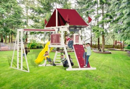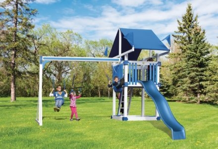 The A-5 Deluxe swing set includes the same flat step ladder, tower, avalanche slide and three position swing beam that comes standard with many of the Kastle Tower Series playsets. Then, it adds a rock wall, steering wheel and bonus fourth swing, to truly earn the name deluxe. imensions 21’w x 15’d x 12’h Weight 928 lbs. Tower 4′ x 4′ deck Deck Height 5′ Access flat step ladder with access railing Roof 4×4 vinyl with sunrise Climber 5′ rock wall with rope Slide 10′ avalanche slide Swing Beam 4 position single beam Swings belt swing, trapeze, baby swing, four-rope tire swing Anchors 2 Accessories steering wheel Border∗ 100′ landscape timber Mulch∗ 2 ton rubber mulch 11 cubic yds. wood mulch. Warranty: Limited Lifetime, 20-Year and 5-Year Warranty Subject to ordinary residential use and proper installation by a certified SK installer. Swing Kingdom warrants to the original purchaser at the original installation address, that the structural components of the playground systems, such as the PVC plastic lumber and wood components are covered by a 20-year warranty. In addition all canopies, slides, metal components, swings and accessories are warranted for 5 years from date of original purchase. Swing Kingdom’s products are not warranted as being suitable for a particular purpose. The suitability of the product is for the purchaser to determine. This warranty does not cover normal wear and tear, failure to properly maintain the product, or damage resulting from misuse or abuse of the product, additionally any acts of nature such as lightning, storms, hurricanes, tornados, earthquakes or any extreme weather conditions. Also any alteration, addition or relocation of the product will void this warranty. Swing Kingdom reserves the right to examine photographs and/or physical evidence of the product claimed to be defective, and to recover product prior to any warranty claims. All products returned for inspection must be sent freight prepaid. In the event of a defect covered by these warranties, Swing Kingdom will remedy the defect within a reasonable time. The remedy will consist of repair or replacement of the defective piece unless it is not practical. Then Swing Kingdom will reimburse the original purchaser for the value of the defective piece. (All freight cost of replacement parts are not cover under warranty and will be the purchaser responsibility to cover) Adult supervision is recommended while enjoying your play system. For safety and comfort reasons, Swing Kingdom reserves the right to make design & construction changes without notice.