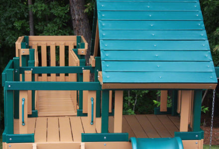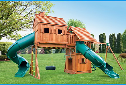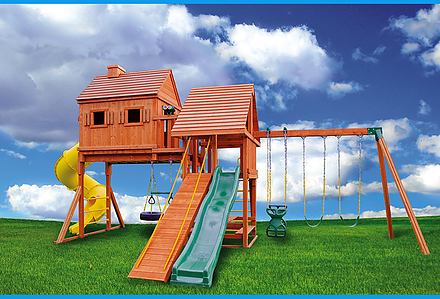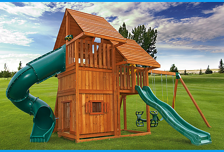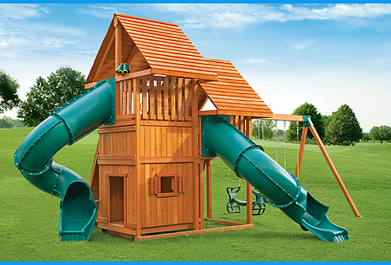 Treasure Trove II Treehouse Swing Set is a spot for fun in your own backyard with Treasure Trove II Treehouse Swing Set! This huge swing set has it all – two covered play decks, a clatter bridge and tower – plus THREE slides! Imaginations will be in overdrive when they’re playing with all of the added accessories. Available with a Tongue & Groove Wood Roof featuring dormers and a chimney and an upper level Treehouse with working shutters and a sunburst. • Wiki Wave Slide™ • Radical Ride 7’ Tube Slide™ • Commercial Grade Super Scoop Slide™ • Clatter Bridge & Tower • Rock Wall with Climbing Rope • Safe Entry Ladder • Deluxe Rope Ladder • Belt Swing • Trapeze Swing • Tandem Swing designed for 1 or 2 riders • Built-In Picnic Table • Sandbox • Bonus Sandbox under Tower • Tic-Tac-Toe Panel • Steering Wheel • Play Telescope • Available with Tongue & Groove Wood Roof featuring Dormers and a Chimney • Upper Level Treehouse with Working Shutters and a Sunburst • Tongue & Groove Wood Roof covering Tower • 4×4 Maintenance-free Timber Shield™ Posts & Main Beams • 4×6 3-Position Maintenance-free Timber Shield™ Swing Beam • Patented One-Piece A-Frame Bracket • Available in Cedar with a beautiful Amber Finish • 15 Year Limited Warranty on Lumber, 1 Year on Accessories **FOR RESIDENTIAL USE ONLY**