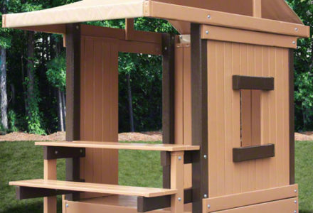 Whether your little one is looking for a pirate fort or the perfect venue for a princess tea party, the C-1 Hideout playhouse fits the bill. This playset is small enough to fit in most backyards and includes a flat step ladder, avalanche slide, sandbox, 3 position climber swing beam, trapeze and two belt swings. Dimensions 17’w x 17’d x 10’6″h Weight 1,597 lbs. Tower 6′ x 8′ base, 5′ x 6′ playhouse with 3′ x 6′ porch, vinyl siding, black shingles, 2 windows with screens & shutters Deck Height 5′ Access flat step ladder with access railing Slide 10′ avalanche slide Swing Beam 3 position climber Swings (2) belt swings, trapeze Anchors 2 Border∗ 96′ landscape timber Mulch∗ 2 ton rubber mulch 10 cubic yds. wood mulch. Warranty: Limited Lifetime, 20-Year and 5-Year Warranty Subject to ordinary residential use and proper installation by a certified SK installer. Swing Kingdom warrants to the original purchaser at the original installation address, that the structural components of the playground systems, such as the PVC plastic lumber and wood components are covered by a 20-year warranty. In addition all canopies, slides, metal components, swings and accessories are warranted for 5 years from date of original purchase. Swing Kingdom’s products are not warranted as being suitable for a particular purpose. The suitability of the product is for the purchaser to determine. This warranty does not cover normal wear and tear, failure to properly maintain the product, or damage resulting from misuse or abuse of the product, additionally any acts of nature such as lightning, storms, hurricanes, tornados, earthquakes or any extreme weather conditions. Also any alteration, addition or relocation of the product will void this warranty. Swing Kingdom reserves the right to examine photographs and/or physical evidence of the product claimed to be defective, and to recover product prior to any warranty claims. All products returned for inspection must be sent freight prepaid. In the event of a defect covered by these warranties, Swing Kingdom will remedy the defect within a reasonable time. The remedy will consist of repair or replacement of the defective piece unless it is not practical. Then Swing Kingdom will reimburse the original purchaser for the value of the defective piece. (All freight cost of replacement parts are not cover under warranty and will be the purchaser responsibility to cover) Adult supervision is recommended while enjoying your play system. For safety and comfort reasons, Swing Kingdom reserves the right to make design & construction changes without notice.