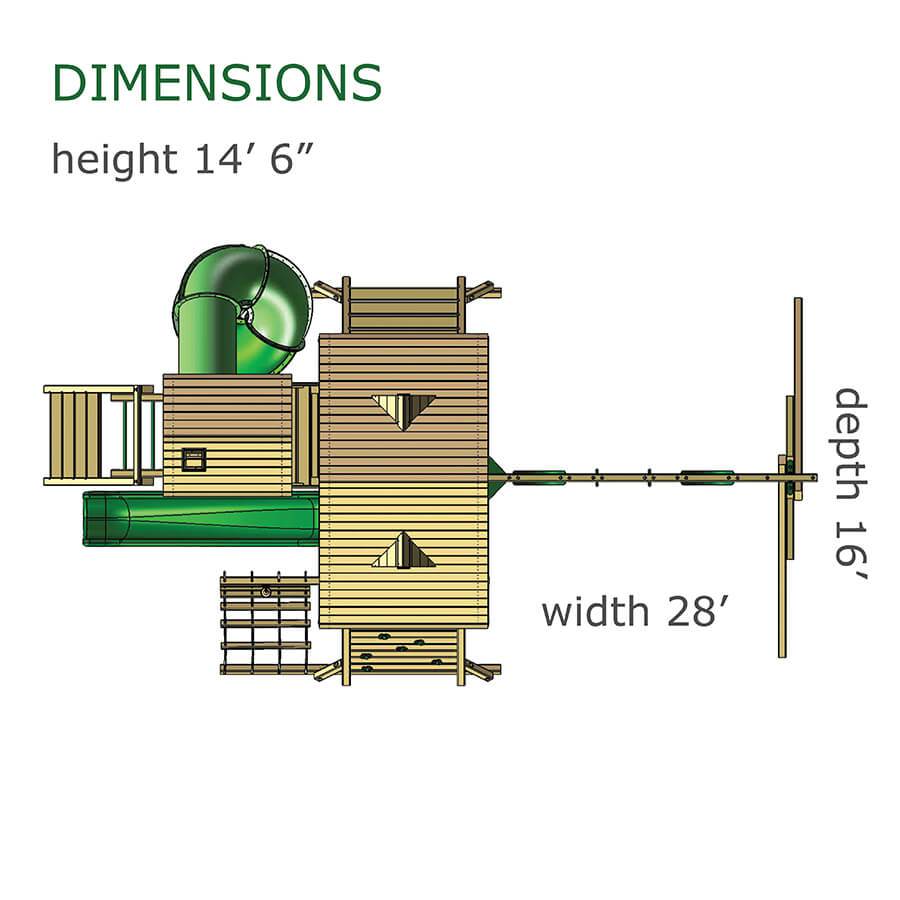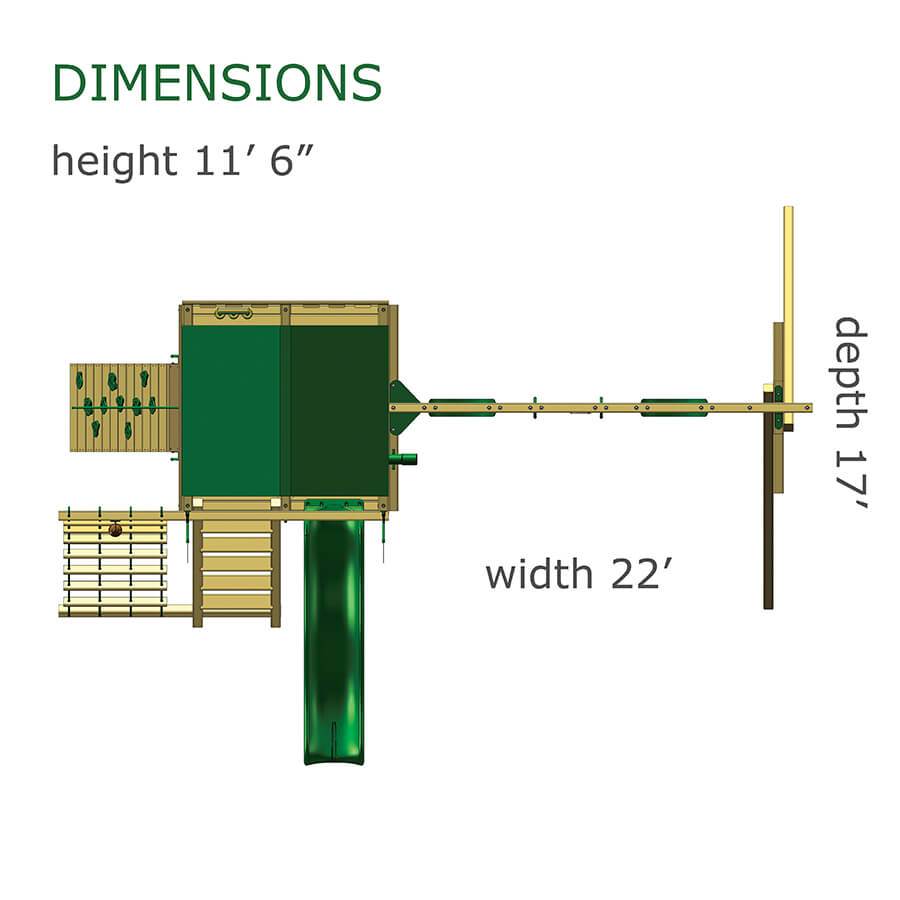 We’ve taken our popular Colossal Kingdom to a whole new level with the addition of a spacious Sky Loft! Here, your little ones can rule the whole planet – or just the backyard. Add in some mammoth sized monkey bars and the strength and coordination meter goes off the charts! • Safe Entry Ladder with Metal Safety Handles • 4×6 Monkey Bar Ladder and Rails • Belt Swings – 2 • Trapeze Swing • 360° Turbo Tire Swing™ with Swivel • Deluxe Rope Ladder • Spacious Sky Loft • Super Scoop Slide™ • Steering Wheel • Play Telescope • Punching Bag • Dinner Bell • Deluxe Tongue & Groove Wood Roofs • Roof Accents include Sunbursts, Dormers and a Chimney • Extended Height Swing Beam with 4×6 Legs • Swing Beam Positions – 3 • Mammoth Rock Wall with Climbing Rope and Metal Safety Handles • Personalized Name Board • Flag Kit • Safety Handles • Available in Redwood Stain and Cedar OR Stained Amber or Unstained Premium Preserved Pine • Lifetime Warranty* **FOR RESIDENTIAL USE ONLY**