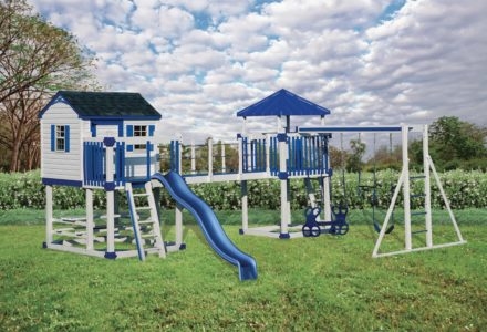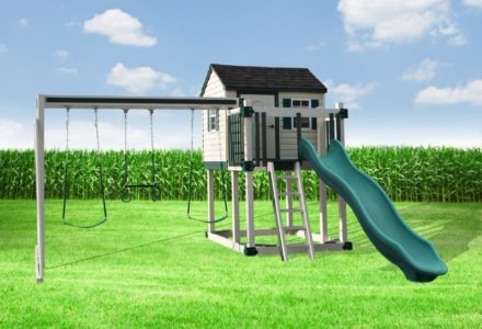 The KC-1 Clubhouse playset boasts a fourteen by twelve foot footprint, which makes it ideal for a yard with limited space. With its two position swing arm, tower with ship’s wheel and binoculars, enclosed clubhouse, step ladder, and ten foot avalanche slide, it is small on space but big on fun. Dimensions 12’w x 14’d x 12′ h Weight 1,012 lbs. Tower 5′ x 5′ deck Deck Height 5′ Access flat step ladder with access railing Roof gable roof Slide 10′ avalanche slide Swing Beam 2 position extension arm Swings belt swing, baby swing Anchors 2 Accessories 5′ x 5′ lower deck, 5′ x 5′ clubhouse, ship’s wheel, binoculars Border∗ 80′ landscape timber Mulch∗ 1 ton rubber mulch 8 cubic yds. wood mulch. Warranty: Limited Lifetime, 20-Year and 5-Year Warranty Subject to ordinary residential use and proper installation by a certified SK installer. Swing Kingdom warrants to the original purchaser at the original installation address, that the structural components of the playground systems, such as the PVC plastic lumber and wood components are covered by a 20-year warranty. In addition all canopies, slides, metal components, swings and accessories are warranted for 5 years from date of original purchase. Swing Kingdom’s products are not warranted as being suitable for a particular purpose. The suitability of the product is for the purchaser to determine. This warranty does not cover normal wear and tear, failure to properly maintain the product, or damage resulting from misuse or abuse of the product, additionally any acts of nature such as lightning, storms, hurricanes, tornados, earthquakes or any extreme weather conditions. Also any alteration, addition or relocation of the product will void this warranty. Swing Kingdom reserves the right to examine photographs and/or physical evidence of the product claimed to be defective, and to recover product prior to any warranty claims. All products returned for inspection must be sent freight prepaid. In the event of a defect covered by these warranties, Swing Kingdom will remedy the defect within a reasonable time. The remedy will consist of repair or replacement of the defective piece unless it is not practical. Then Swing Kingdom will reimburse the original purchaser for the value of the defective piece. (All freight cost of replacement parts are not cover under warranty and will be the purchaser responsibility to cover) Adult supervision is recommended while enjoying your play system. For safety and comfort reasons, Swing Kingdom reserves the right to make design & construction changes without notice.