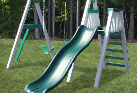The A-4 Special swing set has many features that set it apart. Climb the flat step ladder to the gabled tower. Then, slide down the avalanche slide or build a castle in the sandbox. The ten foot swing beam supports up to three swing positions. Go with the standard glider, infant and belt swing, or customize the swing selection to meet your family’s unique needs. Dimensions 15’w x 15’d x 12’h Weight 721 lbs. Tower 4′ x 4′ deck Deck Height 5′ Access flat step ladder with access railing Roof gable roof Slide 10′ wave slide Swing Beam 3 position single beam Swings belt swing, rubber infant swing, plastic glider with adapter Anchors 2 Border∗ 88′ landscape timber Mulch∗ 2 ton rubber mulch 8 cubic yds. wood mulch – See more at: http://www.swingkingdom.com/playsets/a4.php#sthash.PwCRR5VK.dpufDimensions 13’w x 14’d x 8′ h Weight 486 lbs. Tower 2′ x 2′ deck Deck Height 5′ Access Rung Climber and flat step ladder with access railing Slide 10′ wave slide Swing Beam 3 position climber Swings belt swing, baby swing, trapeze Anchors 4 Border∗ 81′ landscape timber Mulch∗ 1 ton rubber mulch 8 cubic yds. wood mulch. Warranty: Limited Lifetime, 20-Year and 5-Year Warranty Subject to ordinary residential use and proper installation by a certified SK installer. Swing Kingdom warrants to the original purchaser at the original installation address, that the structural components of the playground systems, such as the PVC plastic lumber and wood components are covered by a 20-year warranty. In addition all canopies, slides, metal components, swings and accessories are warranted for 5 years from date of original purchase. Swing Kingdom’s products are not warranted as being suitable for a particular purpose. The suitability of the product is for the purchaser to determine. This warranty does not cover normal wear and tear, failure to properly maintain the product, or damage resulting from misuse or abuse of the product, additionally any acts of nature such as lightning, storms, hurricanes, tornados, earthquakes or any extreme weather conditions. Also any alteration, addition or relocation of the product will void this warranty. Swing Kingdom reserves the right to examine photographs and/or physical evidence of the product claimed to be defective, and to recover product prior to any warranty claims. All products returned for inspection must be sent freight prepaid. In the event of a defect covered by these warranties, Swing Kingdom will remedy the defect within a reasonable time. The remedy will consist of repair or replacement of the defective piece unless it is not practical. Then Swing Kingdom will reimburse the original purchaser for the value of the defective piece. (All freight cost of replacement parts are not cover under warranty and will be the purchaser responsibility to cover) Adult supervision is recommended while enjoying your play system. For safety and comfort reasons, Swing Kingdom reserves the right to make design & construction changes without notice.